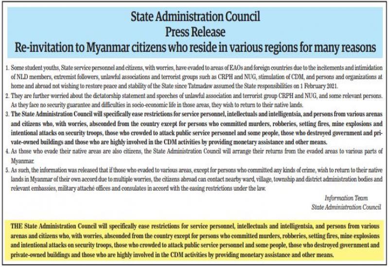 State Administration Council Press Release Re-invitation to Myanmar citizens who reside in various regions for many reasons