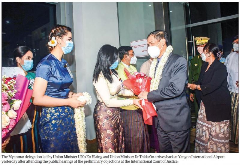 THE Myanmar delegation led by Union Minister for International Cooperation U Ko Ko Hlaing and Union Minister for Legal Affairs and Attorney-General of the Union Dr Thida Oo, who had attended the public hearings of the preliminary objections submitted by Myanmar to the International Court of Justice at the Peace Palace in The Hague of the Netherlands, arrived back in Yangon by air yesterday evening.