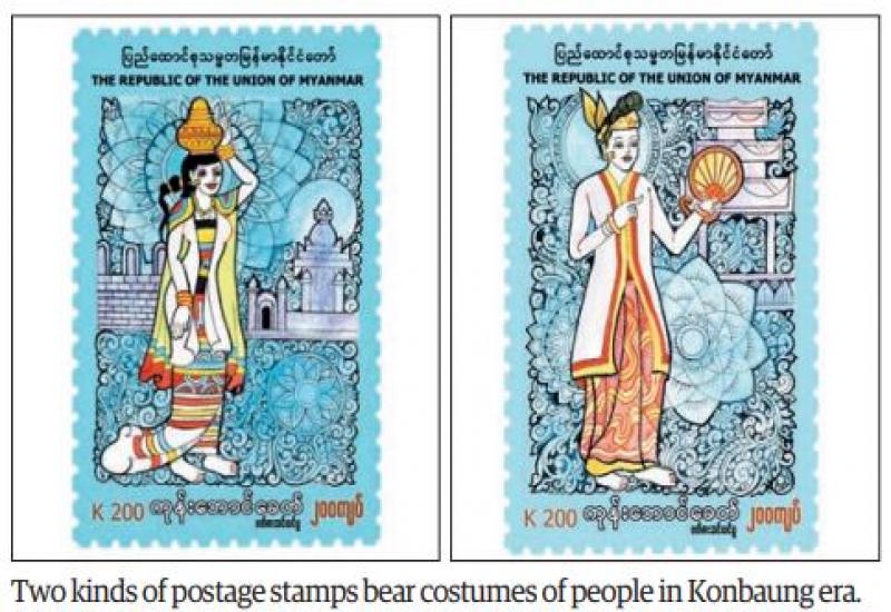 THE MyanmarPost under the Ministry of Transport and Communications will issue two new postage stamps (worth K200) at 9:30 am on 2 March 2022 (1st Waxing of Tabaung 1383 ME), depicting the traditional costumes of men and women in Konbaung Dynasty. The new series will be sold at Central Post Office in Nay Pyi Taw, General Post offices in Yangon and Mandalay and other post offices in each region and state.