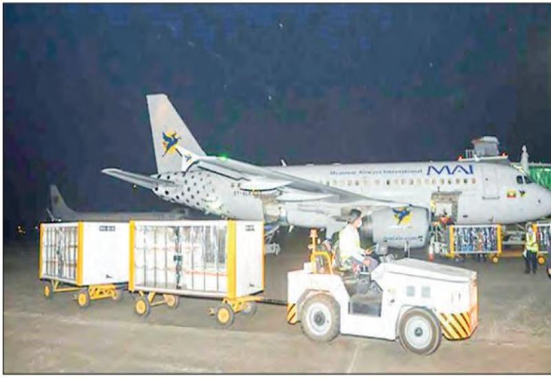 A flight from Myanmar Airways International (MAI) landed at the Yangon International Airport, bringing 100,000 doses of Covishield COVID-19 vaccines in 20 thermocol boxes weighing 400 kilogrammes donated from the Indian Armed Forces to the Myanmar Tatmadaw yesterday.