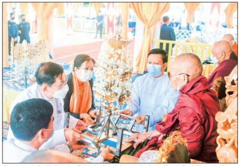A ceremony to hoist Maha Zeyabon golden umbrella and Waziyaketu diamond orb atop Sakkyapadaung Pagoda in conjunction with the consecration ceremony took place in the precinct of YwaU Monastery in Thetthapadaung Village of Lekaing Village-tract in Pwintbyu Township in Magway Region yesterday morning, graced by State Ovadacariya Salin Sayadaw Agga Maha Ganthavacaka Pandita Bhaddanta Ketu and members of the Sangha.