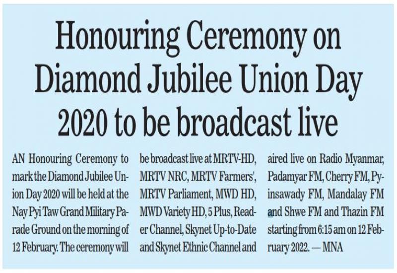 AN Honouring Ceremony to mark the Diamond Jubilee Union Day 2020 will be held at the Nay Pyi Taw Grand Military Parade Ground on the morning of 12 February.