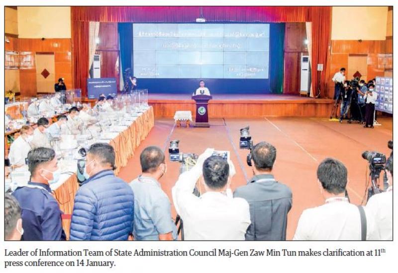 LEADER of the Information Team of the State Administration Council Maj-Gen Zaw Min Tun and member of the Union Election Commission U Khin Maung Oo replied to questions raised by media at the 11th press conference at the hall of the Ministry of Information on 14 January.