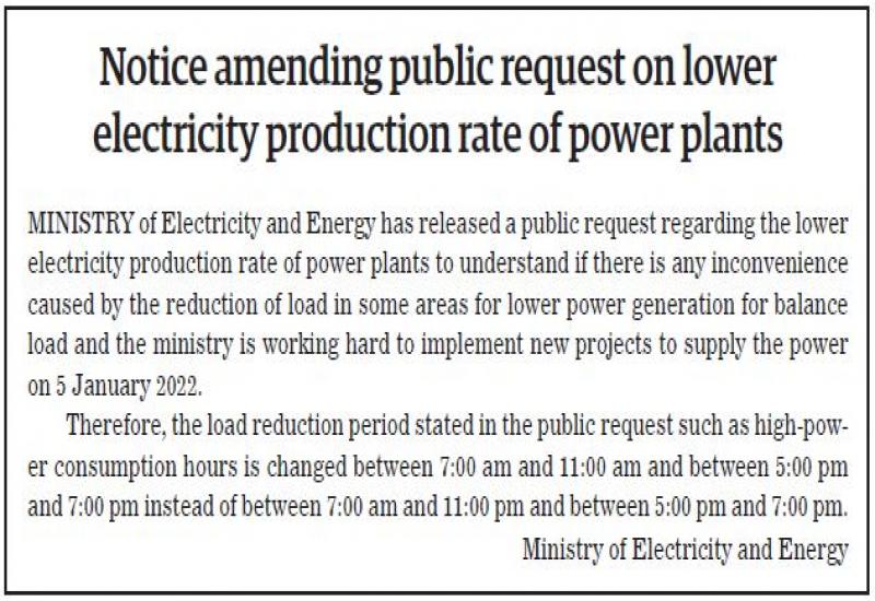 MINISTRY of Electricity and Energy has released a public request regarding the lower electricity production rate of power plants to understand if there is any inconvenience caused by the reduction of load in some areas for lower power generation for balance load and the ministry is working hard to implement new projects to supply the power on 5 January 2022.