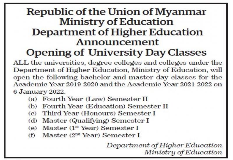 Republic of the Union of Myanmar Ministry of Education Department of Higher Education Announcement Opening of University Day Classes