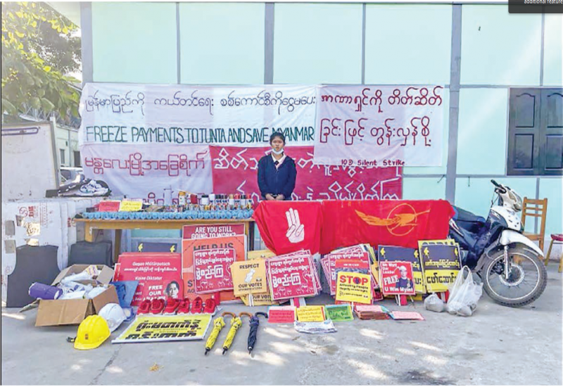 THE combined security forces conducted a patrol at the corner of 30th and 63rd streets in Pyigyimyathman Ward of Chanayethazan Township on 8 December. During the patrol, they examined Khine Zin Zuu and seized pamphlets and one cloth bearing letters for ‘Silent Strike’. Then, they raided her house in Pyigyimyathman Ward of Chanayethazan Township and seized 100 homemade mines, 33 gunpowder cords, 30 shields, three bullet-proof vests, one Bakatha flag with peacock logo, various kinds of medicines and other materials used in protests.