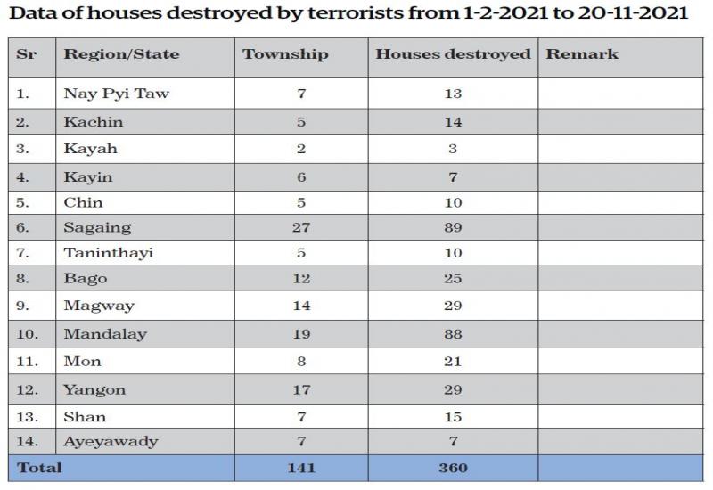 TERRORIST groups CRPH and NUG organized PDFs and intentionally committed destructive attacks to overthrow the government’s administrative machinery. From 1 February up to 20 November 2021, a total of 360 houses were destroyed by terrorist groups.
