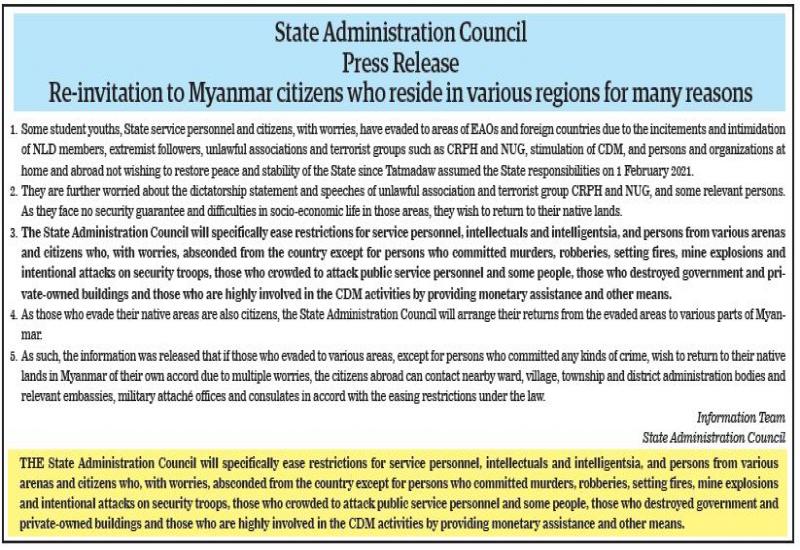 1. Some student youths, State service personnel and citizens, with worries, have evaded to areas of EAOs and foreign countries due to the incitements and intimidation of NLD members, extremist followers, unlawful associations and terrorist groups such as CRPH and NUG, stimulation of CDM, and persons and organizations at home and abroad not wishing to restore peace and stability of the State since Tatmadaw assumed the State responsibilities on 1 February 2021.