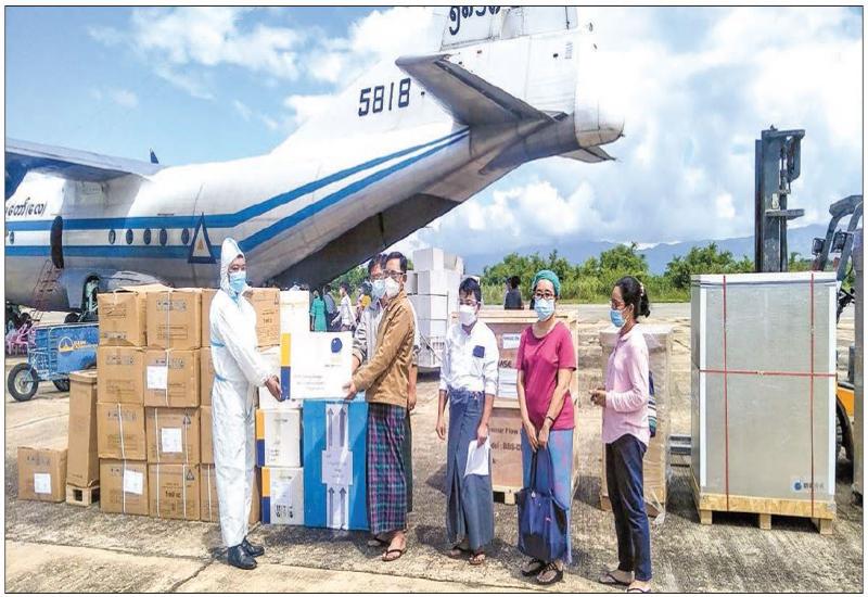 A Tatmadaw aircraft transported 16,000 units of Sinopharm vaccines from Yangon to Kengtung Township of eastern Shan State yesterday. Shan State(East) Medical Services Department and Public Health Department Head Dr Myint Kyaw and officials accepted the Sinopharm vaccines, and Real-Time RT-PCR Machine donated by TICA (Thailand International Cooperation Agency).