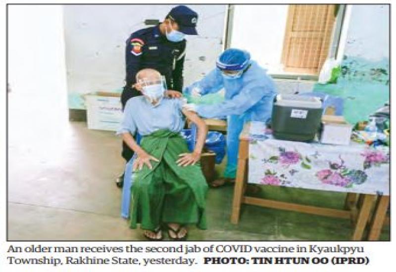 HEALTHCARE officials gave second dose of COVID-19 vaccine to local people at Sandagu Hall in No.3 Basic Education High School in Kyaukpyu Township, Rakhine State, yesterday.