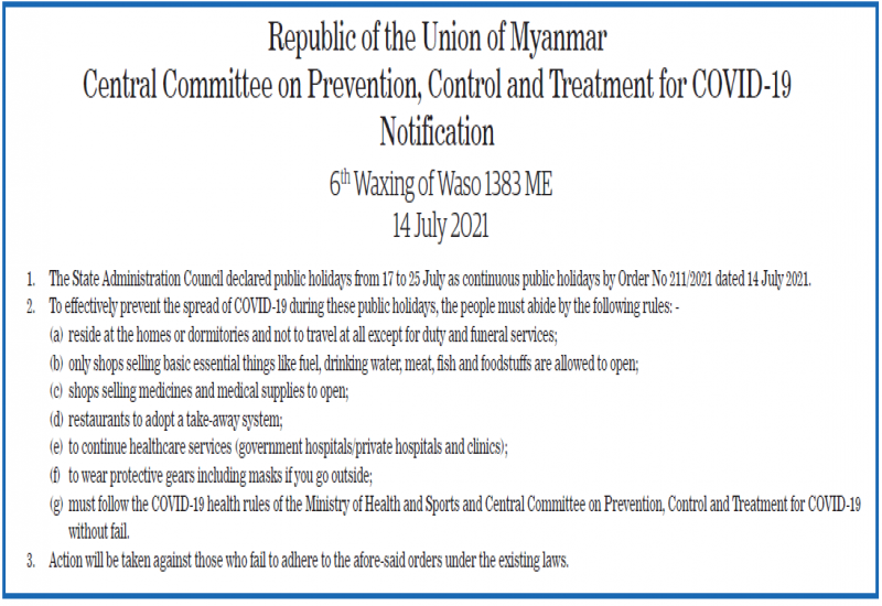 1. The State Administration Council declared public holidays from 17 to 25 July as continuous public holidays by Order No 211/2021 dated 14 July 2021.
