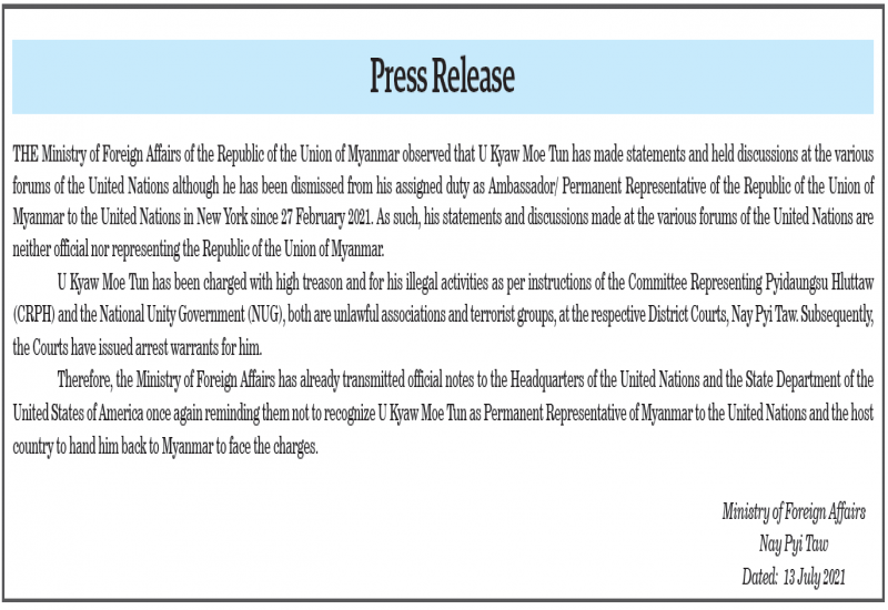 THE Ministry of Foreign Affairs of the Republic of the Union of Myanmar observed that U Kyaw Moe Tun has made statements and held discussions at the various forums of the United Nations although he has been dismissed from his assigned duty as Ambassador/ Permanent Representative of the Republic of the Union of Myanmar to the United Nations in New York since 27 February 2021.
