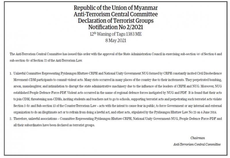 Republic of the Union of Myanmar Anti-Terrorism Central Committee Declaration of Terrorist Groups Notification No 2/2021