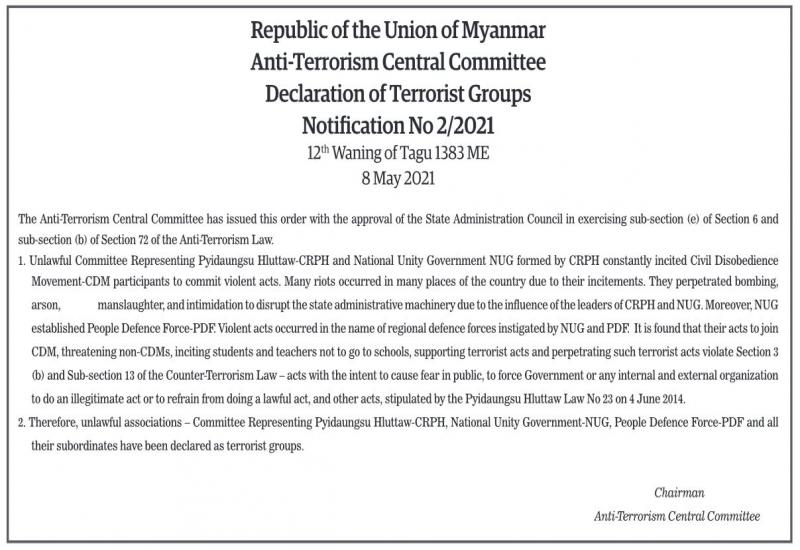 Republic of the Union of MyanmarAnti-Terrorism Central CommitteeDeclaration of Terrorist GroupsNotication No 2/2021