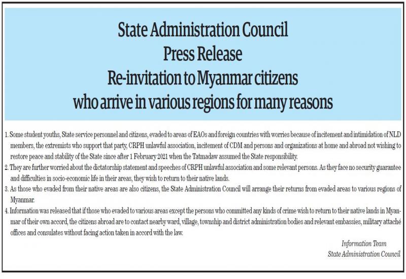 State Administration Council Press Release Re-invitation to Myanmar citizens who arrive in various regions for many reasons