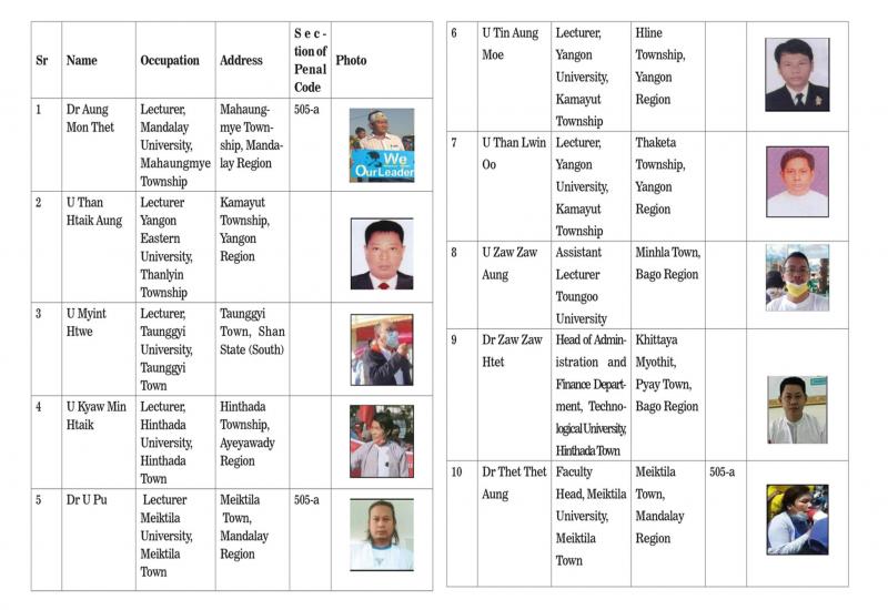 THE following education department personnel have been charged under Section 505-A of the Penal Code for inciting State service personnel and education staff to participate in CDM activities, themselves participating in it, supporting CDM activities and unlawful CRPH association with the aim of deteriorating the State administrative machinery.