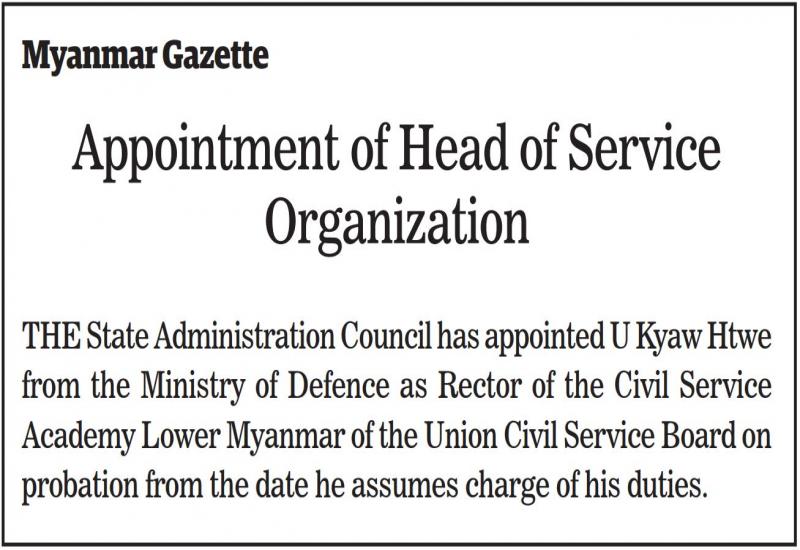 THE State Administration Council has appointed U Kyaw Htwe from the Ministry of Defence as Rector of the Civil Service Academy Lower Myanmar of the Union Civil Service Board on probation from the date he assumes charge of his duties.