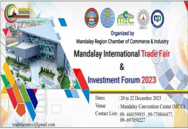 THE Mandalay International Trade Fair and Investment Forum 2023 is scheduled to take place at the Mandalay Convention Centre in Chanmyathazi Township, Mandalay Region, as announced by the Mandalay Region Chambers of Commerce and Industry (MRCCI). MRCCI