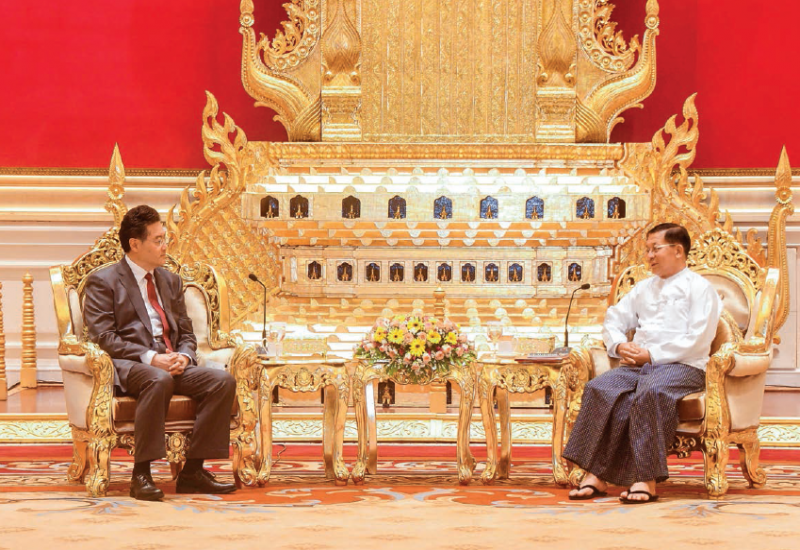 CHAIRMAN of the State Administration Council Prime Minister Senior General Min Aung Hlaing received State Councillor of the People’s Republic of China and Minister of Foreign Affairs Mr Qin Gang at the parlour of the Credentials Hall of the SAC Chairman Office in Nay Pyi Taw yesterday afternoon.