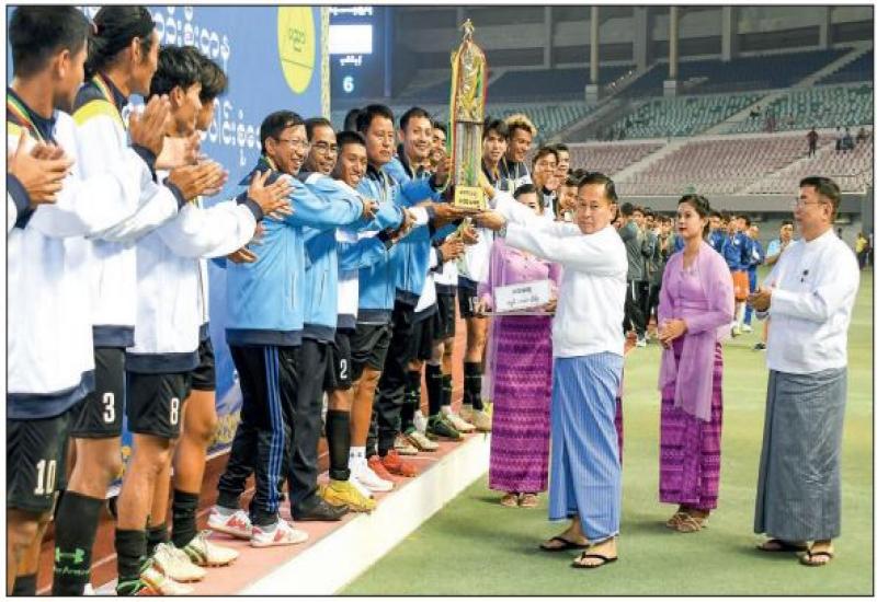VICE-CHAIRMAN of the State Administration Council Deputy Prime Minister Vice-Senior General Soe Win watched the final match of the men’s football tournament of the Inter-Universities, Degree Colleges for the 2022- 2023 Academic Year and awarded prizes to relevant teams at the prize-giving ceremony at Wunna Theikdi Stadium in Nay Pyi Taw yesterday afternoon.