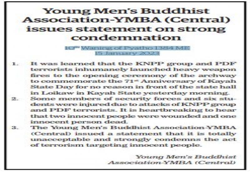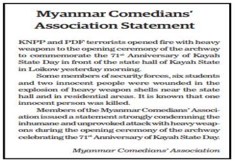 KNPP and PDF terrorists attacked in an inhumane way with heavy weapons from about 4,000 metres northeast of Loikaw at around 7:15 am on 15 January at the opening ceremony of the archway to commemorate 71st Anniversary of Kayah State Day with participation of local ethnic people. The heavy weapon shells fell near the State Hall and in the residential areas. Some members of the security forces, six students, one male and one female innocent people were injured and one male innocent civilian was killed.