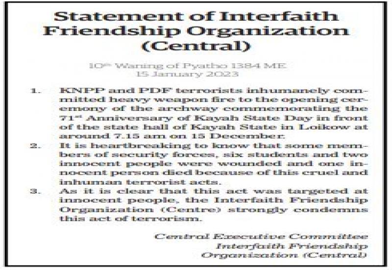 Statement of Interfaith Friendship Organization (Central) 10th Waning of Pyatho 1384 ME 15 January 2023