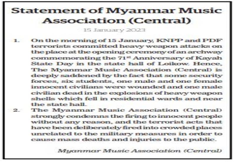Statement of Myanmar Music Association (Central) 15 January 2023
