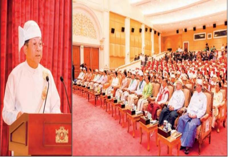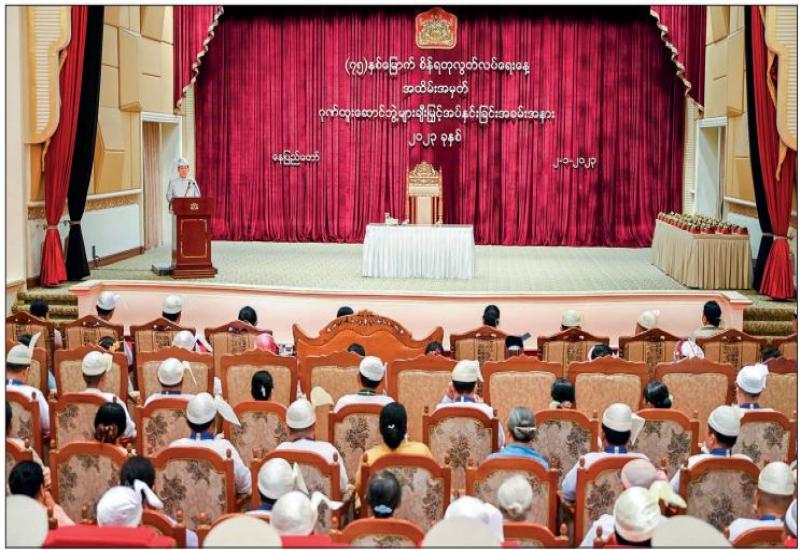 A ceremony to confer honorary titles on recipients to mark the Diamond Jubilee Independence Day 2023 took place at the Thabin Hall of the State Administration Council Chairman Office yesterday morning, attended by SAC Chairman Prime Minister Senior General Thadoe Maha Thray Sithu Thadoe Thiri Thudhamma Min Aung Hlaing who spoke on the occasion and presented honorary titles.