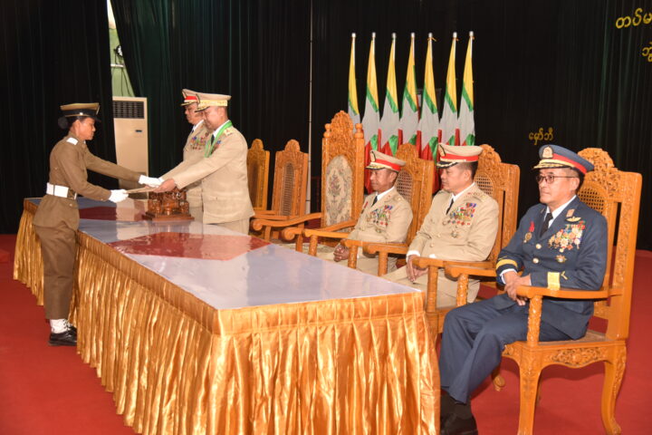Military Appointment- General Lt-Gen Htein Win, together with senior Tatmadaw officers and the acting commandant, took their seats on the stage. Lt-Gen Htein Win presented certificates of commissioning to the graduating cadets, delivered the convocation speech, and concluded the event.