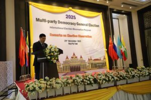 On behalf of our country, I would like to express our gratitude for inviting us to come and observe. We are especially pleased and honoured to have had the opportunity, over the past three days, to study how Myanmar is organizing and conducting its election. We are particularly grateful to the Myanmar Election Commission for inviting and granting us this observation opportunity. Notably, the successful conduct of these elections reflects the agreements and cooperative efforts between Myanmar’s Acting President Senior General Min Aung Hlaing and Chinese President Xi Jinping. Myanmar and China have been collaborating on many initiatives, and China continues to provide substantial support to Myanmar. Yesterday, we visited six polling stations in Nay Pyi Taw. From my observations, everything appeared to be well-organised and running smoothly. Specifically, the preparation and arrangement of the polling stations were systematic, and we saw voters participating actively. At the last polling station, even about an hour before closing, people were still lined up and waiting to cast their votes. We observed that the staff responsible for the election were performing their duties accurately and efficiently. They were carefully verifying voters’ ID cards and information, working with patience and diligence. The first part of this election is proceeding smoothly and peacefully. Since it has been successful, we believe that Phases II and III can also be conducted successfully. We also noticed that voters have expectations that after the election, their lives will improve, the economy will get better, and in some areas, conflicts will decrease, leading to greater peace and stability. This election is an internal affair for Myanmar, and from China’s perspective, it is successful. We believe it will contribute to national reconciliation and coexistence. China and Myanmar maintain good, friendly, and cooperative relations. We are always ready to assist Myanmar and are committed to supporting initiatives that foster development between the two countries. Therefore, we hope that this election will contribute to the economic and social development of Myanmar through collaborative efforts.
