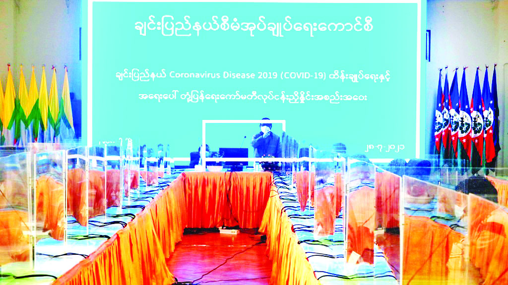 အစည်းအဝေးတွင် တက် ရောက်လာကြသည့် ဌာနဆိုင်ရာ တာဝန်ရှိသူများက ကိုဗစ်-၁၉ ရောဂါကူးစက်မှု၊ သေဆုံးမှုနှင့် ကာကွယ်၊ ထိန်းချုပ်၊ ကုသရေး လုပ်ငန်းများ ဆောင်ရွက်မှု အခြေ အနေများ၊ ကိုဗစ်-၁၉ ကာကွယ် ဆေးထိုးနှံရေးအတွက် ဆောင် ရွက်ပြီးစီးမှုများကို ရှင်းလင်း တင်ပြကြရာ တင်ပြချက်များ အပေါ် ပြည်နယ်စီမံအုပ်ချုပ်ရေး ကောင်စီ အတွင်းရေးမှူး ဦးမောင်မောင်ဆန်းနှင့် ပြည်နယ် စီမံ အုပ်ချုပ်ရေးကောင်စီဝင်များ က ဖြည့်စွက်ဆွေးနွေးကြ သည်။