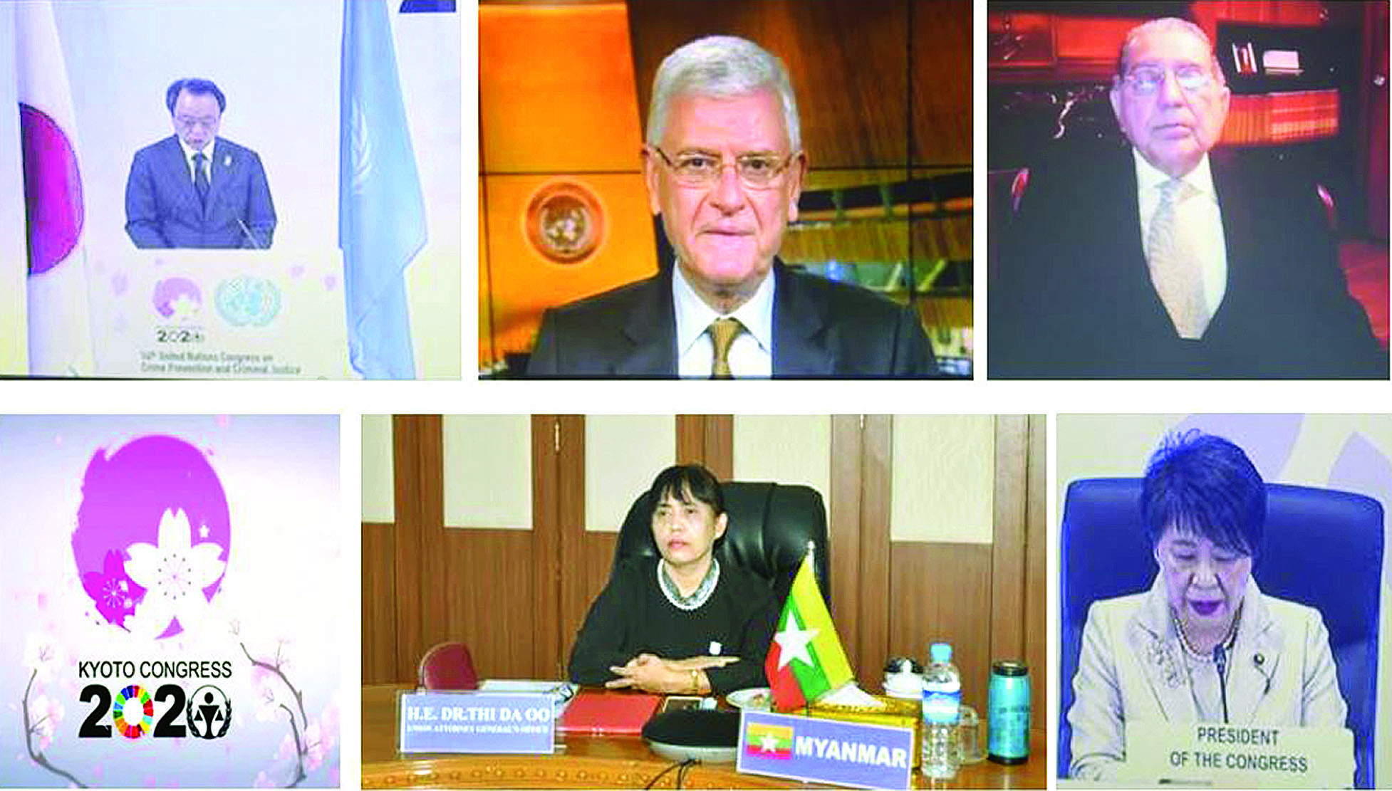 နေပြည်တော် မတ် ၇ ဂျပန်နိုင်ငံ ကျိုတိုအပြည်ပြည် ဆိုင်ရာ ညီလာခံစင်တာ၌ ကျင်းပ သော 14th United Nations Congress on Crime Prevention and Criminal Justice သို့ ပြည်ထောင်စု ရှေ့နေချုပ် ဒေါက်တာသီတာဦး ဦးဆောင် ၍ ပြည်ထဲရေးဝန်ကြီးဌာနနှင့် ပြည်ထောင်စုရှေ့နေချုပ်ရုံးတို့ ပါဝင်သည့် မြန်မာကိုယ်စားလှယ် အဖွဲ့သည် ဗီဒီယိုကွန်ဖရင့် စနစ်ဖြင့် တက်ရောက်ကြ သည်။ ဆွေးနွေး ညီလာခံသို့ ကုလသမဂ္ဂ အဖွဲ့ဝင် နိုင်ငံများ၊ လေ့လာသူများ၊ အပြည်ပြည်ဆိုင်ရာ အဖွဲ့အစည်း များ၊ အစိုးရမဟုတ်သော အဖွဲ့ အစည်းများနှင့် ပညာရှင်များ ပါဝင်တက်ရောက်ခဲ့ကြပြီး လူမှု စီးပွား ဖွံ့ဖြိုးတိုးတက်ရေးအတွက် ပြစ်မှုဆိုင်ရာ တရားမျှတမှုတွင် ကြုံတွေ့နေရသည့် စိန်ခေါ်မှု များနှင့် ဘက်ပေါင်းစုံချဉ်းကပ်မှု၊ တရားဥပဒေစိုးမိုးမှု တိုးတက် ကောင်းမွန်ရေးဆိုင်ရာ ကြိုးပမ်း ဆောင်ရွက်မှုများ၊ အကြမ်းဖက် မှုများ၊ လူကုန်ကူးမှုများနှင့် မူးယစ် ဆေးဝါး တားဆီးနှိမ်နင်းရေး စသည့် နိုင်ငံဖြတ်ကျော် မှုခင်း များတွင် အဖွဲ့ဝင်နိုင်ငံအချင်းချင်း ပူးပေါင်း ဆောင်ရွက်မှုများနှင့် နည်းပညာ အကူအညီများကို ဆွေးနွေးခဲ့ကြသည်။ သတင်းစဉ်