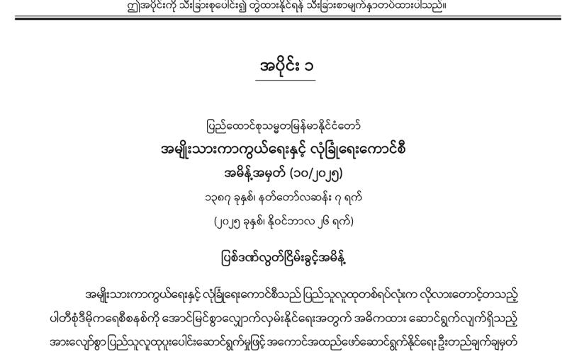 အပိုင်း (၁) တွင် အမျိုးသားကာကွယ်ရေးနှင့် လုံခြုံရေးကောင်စီရုံး အမိန့်ကြော်ငြာစာ၊ ပြည်ထောင်စုတရား လွှတ်တော်ချုပ် အမိန့်ကြော်ငြာစာ၊ နိုင်ငံတော်ဖွဲ့စည်းပုံအခြေခံဥပဒေဆိုင်ရာခုံရုံး အမိန့်ကြော်ငြာစာ၊ ပြည်ထောင်စု ရွေးကောက်ပွဲကော်မရှင် အမိန့်ကြော်ငြာစာ၊ အဂတိလိုက်စားမှုတိုက်ဖျက်ရေးကော်မရှင်ရုံး အမိန့်ကြော်ငြာစာ၊ ပုဂ္ဂလိကပိုင်ပြုလုပ်ရေးကော်မရှင် အမိန့်ကြော်ငြာစာ၊ မြန်မာနိုင်ငံစားသုံးသူကာကွယ်ရေးကော်မရှင် အမိန့် ကြော်ငြာစာ၊ အမျိုးသားသဘာဝဘေးအန္တရာယ်ဆိုင်ရာစီမံခန့်ခွဲမှုကော်မတီ အမိန့်ကြော်ငြာစာ၊ စက်မှုလုပ်ငန်းနှင့် စက်မှုဇုန်ဖွံ့ဖြိုးတိုးတက်ရေးဗဟိုကော်မတီ အမိန့်ကြော်ငြာစာ၊ မြေလွတ်၊ မြေလပ်နှင့် မြေရိုင်းများစီမံခန့်ခွဲရေး ဗဟိုကော်မတီ အမိန့်ကြော်ငြာစာ၊ အမျိုးသားခရီးသွားလုပ်ငန်းဖွံ့ဖြိုးတိုးတက်ရေးဗဟိုကော်မတီ အမိန့်ကြော်ငြာ စာ၊ ကျေးလက်ဒေသနေ ပြည်သူများနှင့် တိုင်းရင်းသားပြည်သူများ စာတတ်မြောက်ရေး အကောင်အထည်ဖော် ဆောင်ရွက်ရေးဦးစီးကော်မတီ အမိန့်ကြော်ငြာစာ၊ အသေးစား၊ အငယ်စားနှင့် အလတ်စားစီးပွားရေးလုပ်ငန်းများ ဖွံ့ဖြိုးတိုးတက်ရေးလုပ်ငန်းကော်မတီ အမိန့်ကြော်ငြာစာ၊ ခရီးသွားလုပ်ငန်းကော်မတီ အမိန့်ကြော်ငြာစာ၊ နယ်စပ် ဒေသနှင့် တိုင်းရင်းသားလူမျိုးများ၏ ဖွံ့ဖြိုးတိုးတက်မှု အကောင်အထည်ဖော်ရေး ဗဟိုကော်မတီ အမိန့် ကြော်ငြာစာ၊ နိုင်ငံခြားသားများကြီးကြပ်စောင့်ရှောက်ရေးဗဟိုကော်မတီ အမိန့်ကြော်ငြာစာ၊ အမျိုးသားမြေအသုံး ချမှုကောင်စီ အမိန့်ကြော်ငြာစာ၊ ဗဟိုလယ်ယာမြေစီမံခန့်ခွဲမှုအဖွဲ့ အမိန့်ကြော်ငြာစာ၊ မြန်မာအထူးစီးပွားရေး ဇုန်ဆိုင်ရာဗဟိုအဖွဲ့ အမိန့်ကြော်ငြာစာ၊ ပို့ဆောင်ရေးနှင့် ဆက်သွယ်ရေးဝန်ကြီးဌာန (ဝန်ကြီးရုံး) အမိန့်ကြော် ငြာစာ၊ ပြည်ထဲရေးဝန်ကြီးဌာန (ဝန်ကြီးရုံး) အမိန့်ကြော်ငြာစာ၊ ပြန်ကြားရေးဝန်ကြီးဌာန အမိန့်ကြော်ငြာစာ၊ စိုက်ပျိုးရေး၊ မွေးမြူရေးနှင့် ဆည်မြောင်းဝန်ကြီးဌာန (ပြည်ထောင်စုဝန်ကြီးရုံး) အမိန့်ကြော်ငြာစာ၊ သယံဇာတနှင့် သဘာဝပတ်ဝန်းကျင်ထိန်းသိမ်းရေးဝန်ကြီးဌာန (ပြည်ထောင်စုဝန်ကြီးရုံး) အမိန့်ကြော်ငြာစာ၊ စက်မှုဝန်ကြီးဌာန အမိန့်ကြော်ငြာစာ၊ ပညာရေးဝန်ကြီးဌာန (ဝန်ကြီးရုံး) အမိန့်ကြော်ငြာစာ၊ ဆောက်လုပ်ရေးဝန်ကြီးဌာန အမိန့်ကြော် ငြာစာတို့ ပါဝင်ပါသည်။