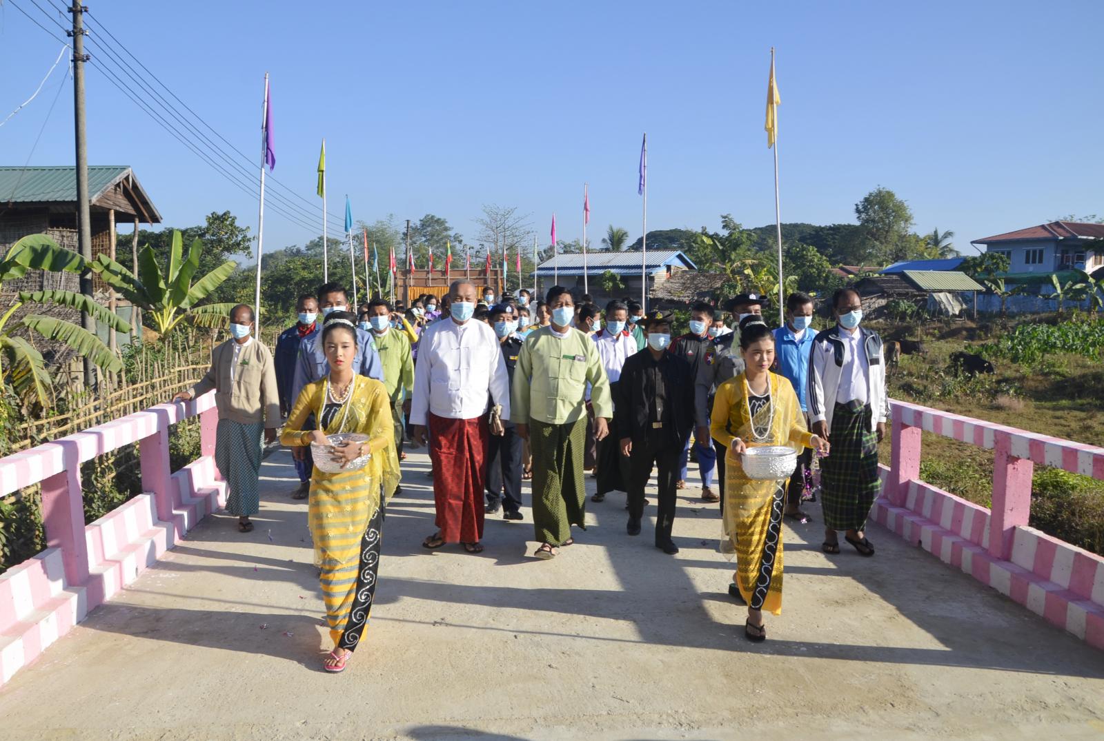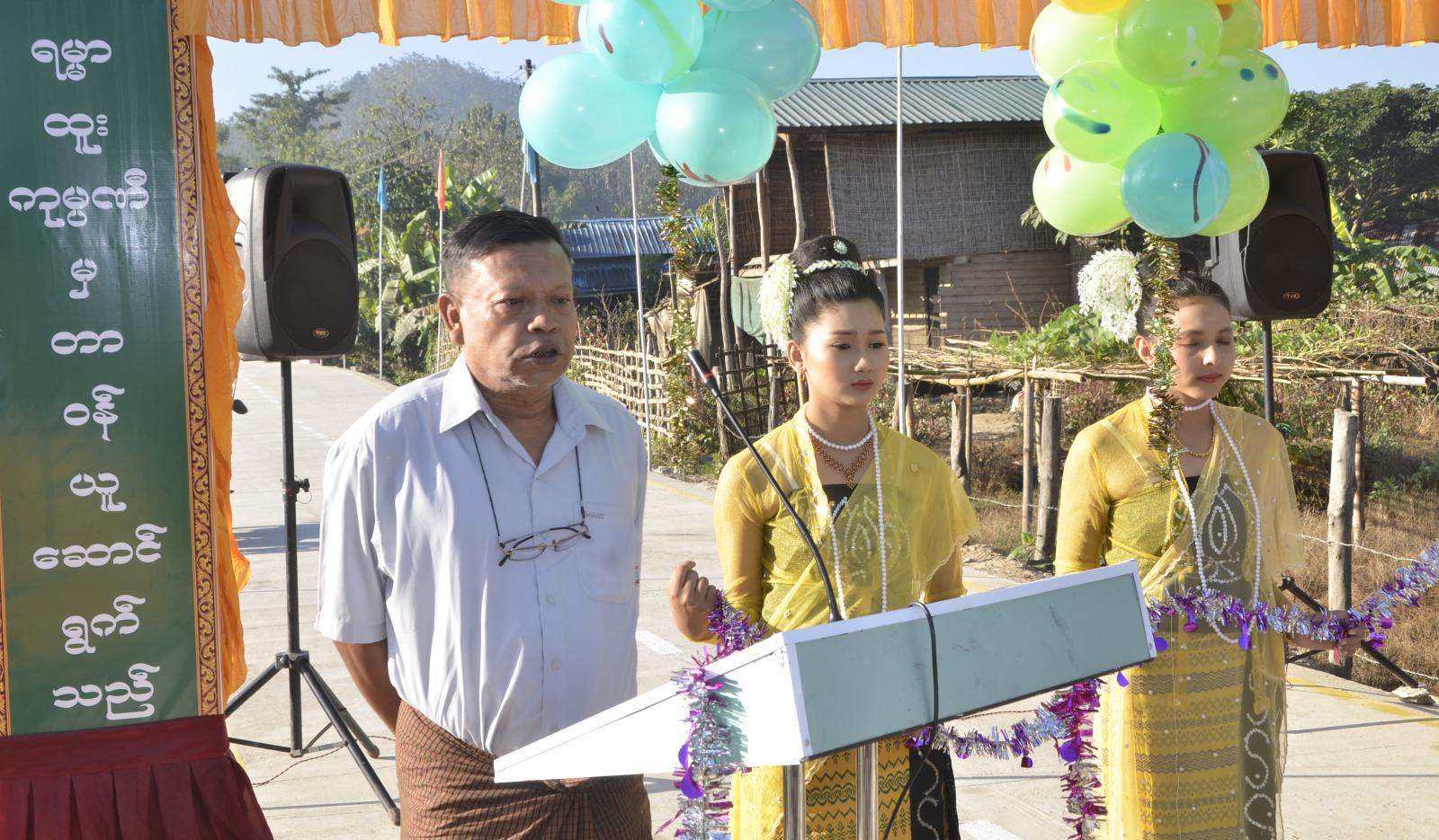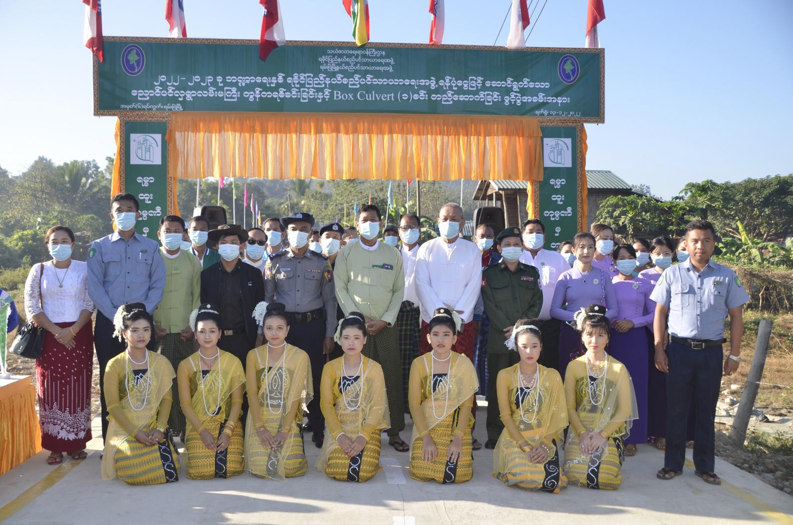 ဆက်လက်ပြီး ကွန်းကရစ်လမ်းသစ်နှင့် Box Culvert သစ်ဖွင့်ပွဲ အထိမ်းအမှတ်အလံငယ်အား မြို့နယ်စည်သာရေးအဖွဲ့အမှုဆောင်အရာရှိ ဦးဇေယျာဖြိုးမှ မြို့နယ်စီမံအုပ်ချုပ်ရေးအဖွဲ့ ဦးခင်မောင်သန်းထံသို့ ပေးအပ်ပြီးနောက် မြို့နယ်စီမံအုပ်ချုပ်ရေးအဖွဲ့ဥက္ကဋ္ဌ ဦးခင်မေင်သန်း၊ အမှုဆောင်အရာရှိ ဦးဇေယျာဖြိုးနှင့် မြို့မိမြို့ဖ ဦးအောင်စိုးတို့က ဖဲကြိုးဖွင့်လှစ်ပေးကြသည်။