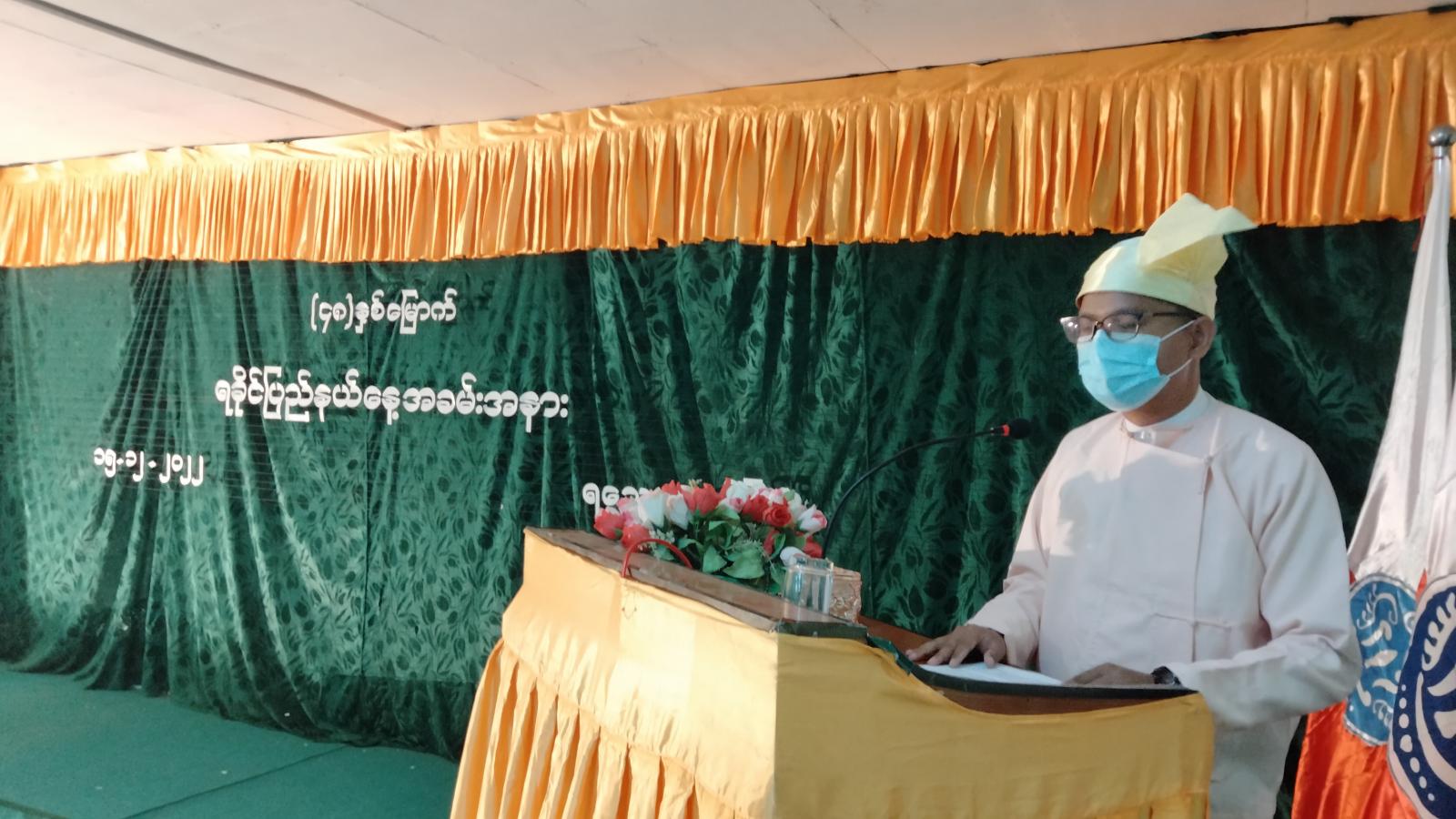 ရှေးဦးစွာ နိုင်ငံတော် စီမံအုပ်ချုပ်ရေးကောင်စီဥက္ကဋ္ဌ၊ နိုင်ငံတော်ဝန်ကြီးချုပ် ဗိုလ်ချုပ်မှူးကြီး မင်းအောင်လှိုင်ထံမှ (၄၈)နှစ်မြောက် ရခိုင်ပြည်နယ်နေ့ အခမ်းအနားသို့ ပေးပို့သည့် သဝဏ်လွှာကို မြို့နယ်စီမံအုပ်ချုပ်ရေးအဖွဲ့ ဥက္ကဋ္ဌ ဦးနိုင်လင်းထက်က ဖတ်ကြားသည်။