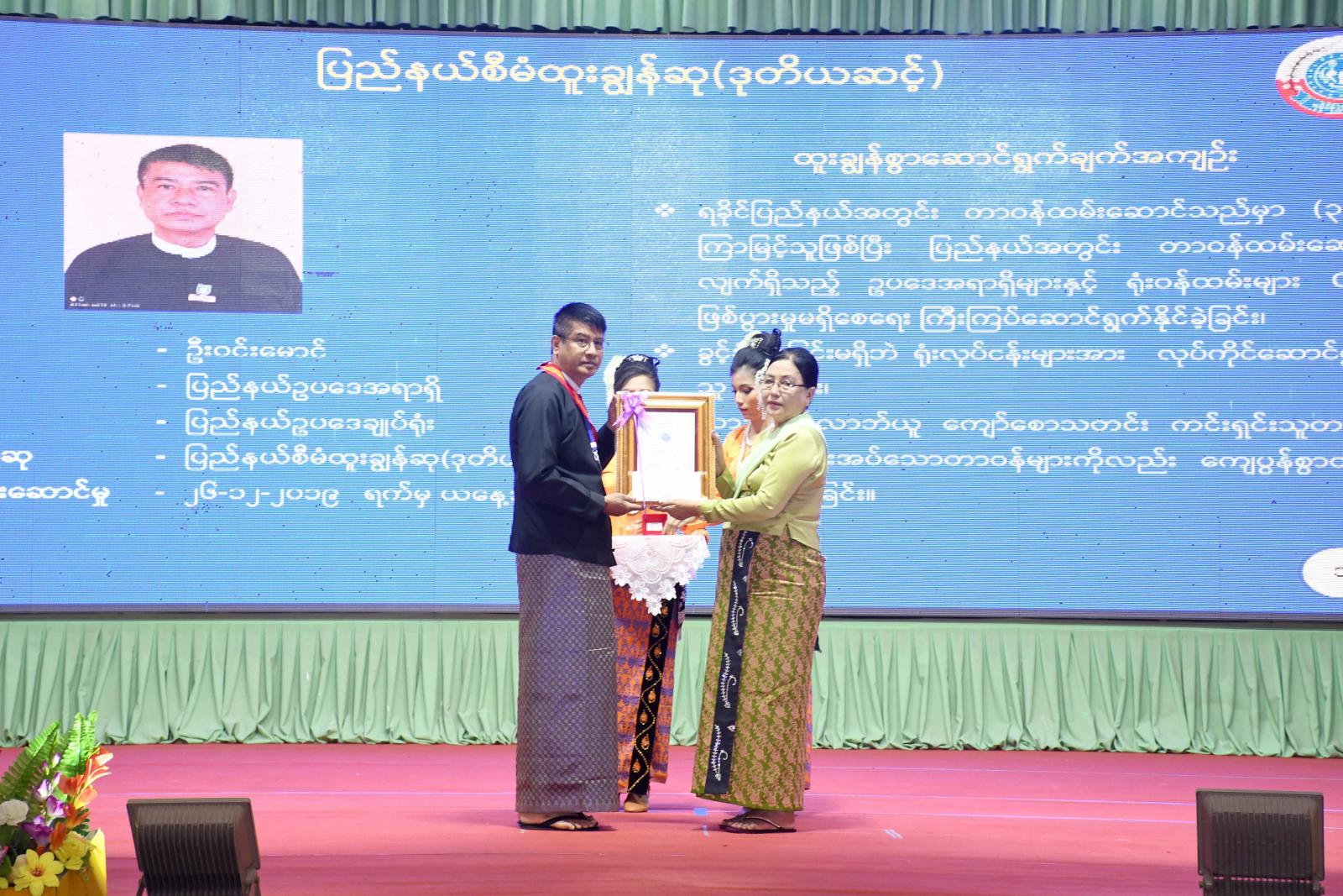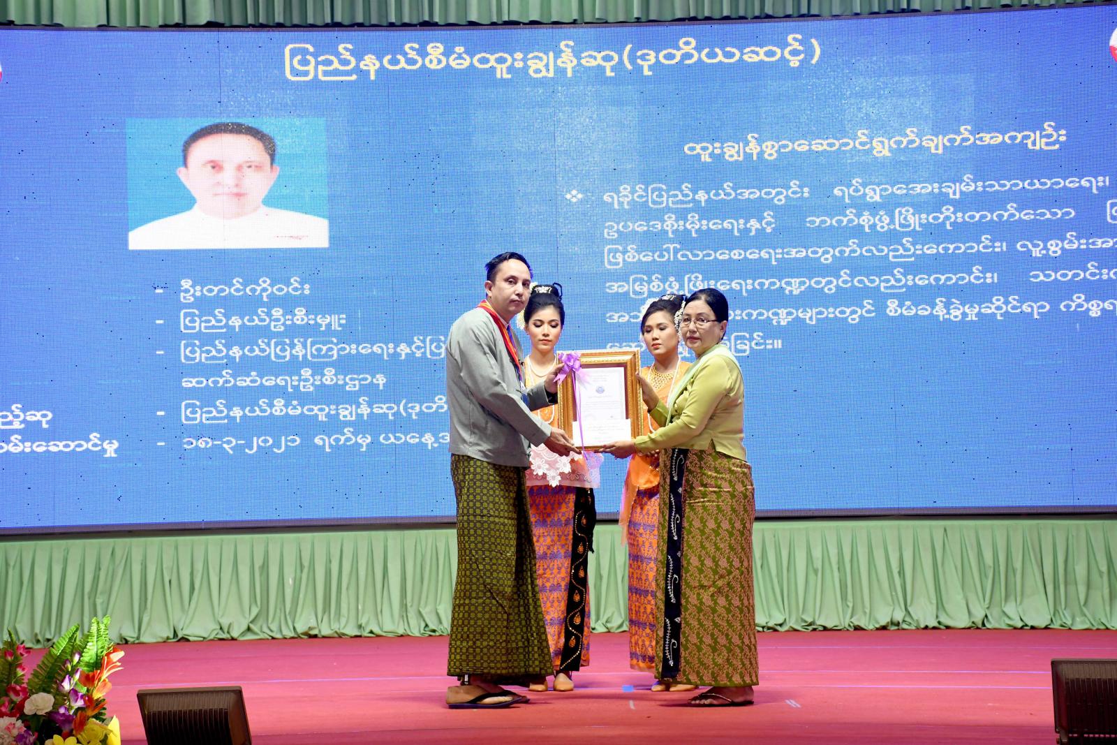 ဆက်လက်၍ ရခိုင်ပြည်နယ်နေ့ အထိမ်းအမှတ် ဂုဏ်ထူးဆောင်လက်မှတ်၊ ဂုဏ်ထူးဆောင် ဆုပစ္စည်းများ၊ မှတ်တမ်းတင်ဂုဏ်ပြုလွှာဆု ရရှိသူများနှင့် စာစီစာကုံး၊ ပန်းချီပြိုင်ပွဲများတွင် ဆုရရှိသူများအား ဆုတံဆိပ်များ ချီးမြှင့်ရာ နိုင်ငံတော်စီမံအုပ်ချုပ်ရေးကောင်စီအဖွဲ့ဝင် စည်သူ ဒေါ်အေးနုစိန်က ပြည်နယ်စီမံထူးချွန်ဆု (ဒုတိယအဆင့်) ရရှိသူ (၆) ဦးအားလည်းကောင်း၊ ပြည်နယ်ဝန်ကြီးချုပ်၊ တိုင်းမှူးနှင့် တာဝန်ရှိသူများက ပြည်နယ်စီမံထူးချွန်ဆု (တတိယအဆင့်)ရရှိသူ ၆ ဦး၊ ပြည်နယ်လယ်ယာစီးပွားထူးချွန်ဆု (ဒုတိယအဆင့်)ရရှိသူနှစ်ဦး၊ ပြည်နယ်လူမှုထူးချွန်ဆု (ဒုတိယအဆင့်) ရရှိသူ ၁၂ ဦး၊ ပြည်နယ်လူမှုထူးချွန်ဆူ (တတိယအဆင့်)ရရှိသူ ၉ ဦး၊ ရခိုင်ပြည်နယ် အစိုးရအဖွဲ့၏ဂုဏ်ပြုမှတ်တမ်းလွှာရရှိသူ ၁၀၆ ဦး၊ ရခိုင်ပြည်နယ်နေ့အထိမ်းအမှတ် တက္ကသိုလ်အဆင့် စာစီစာကုံး၊ ပန်းချီ၊ အခြေခံပညာ အထက်တန်းအဆင့် စာစီစာကုံး၊ ပန်းချီနှင့် အခြေခံပညာ အလယ်တန်းအဆင့် စာစီစာကုံး၊ ပန်းချီ ပြိုင်ပွဲများတွင် ပထမ၊ ဒုတိယ၊ တတိယနှင့် နှစ်သိမ့်ဆုရရှိကြသည့်ကျောင်းသား၊ ကျောင်းသူ(၃၀) အား ဆုများအသီးသီး ပေးအပ်ချီး မြှင့်ကြသည်။