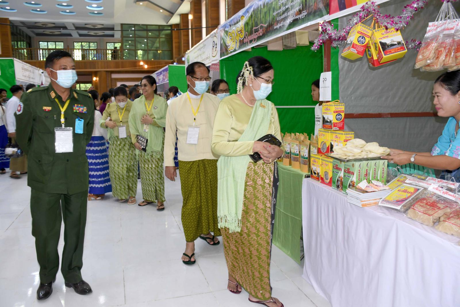 ထို့နောက် နိုင်ငံတော်စီမံအုပ်ချုပ်ရေးကောင်စီအဖွဲ့ဝင် စည်သူဒေါ်အေးနုစိန်၊ ပြည်နယ်ဝန်ကြီးချုပ်၊ တိုင်းမှူးနှင့် တာဝန်ရှိသူများသည် စစ်တွေမြို့၊ ခိုင်သဇင်ပန်းခြံအတွင်း၌ MSME ထုတ်ကုန်ပြပွဲနှင့် ရောင်းချပွဲတွင် ရခိုင်ပြည်နယ်မှ ထွက်ရှိသော ရေထွက်ပစ္စည်းများ၊ စိုက်ပျိုးရေးထုတ်ကုန်များ၊ စားသောက်ကုန်များ၊ လူသုံးကုန်ပစ္စည်းများ၊ ရိုးရာရက်ကန်းလုပ်ငန်းများကို ပြခန်းပေါင်း (၅၁)ခန်း ဖွင့်လှစ်ကာ ပြသရောင်းချနေမှုကို လှည့်လည်ကြည့်ရှုခဲ့ကြောင်းသိရသည်။