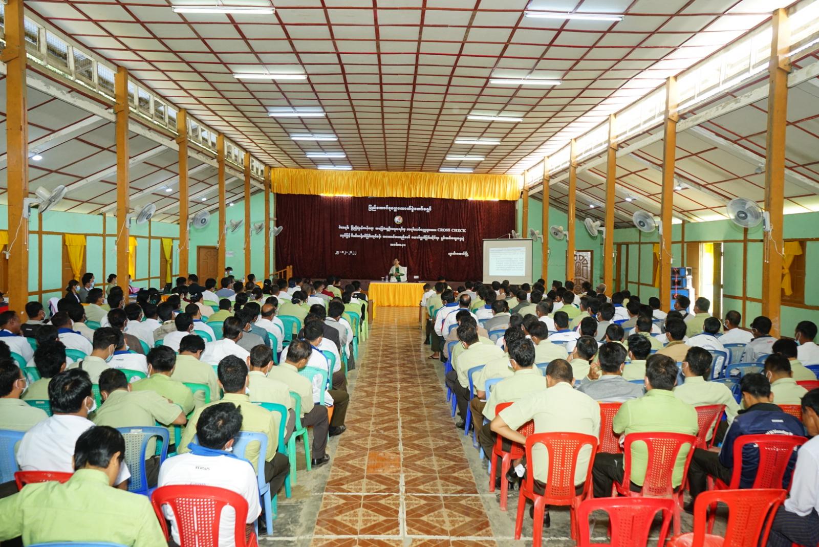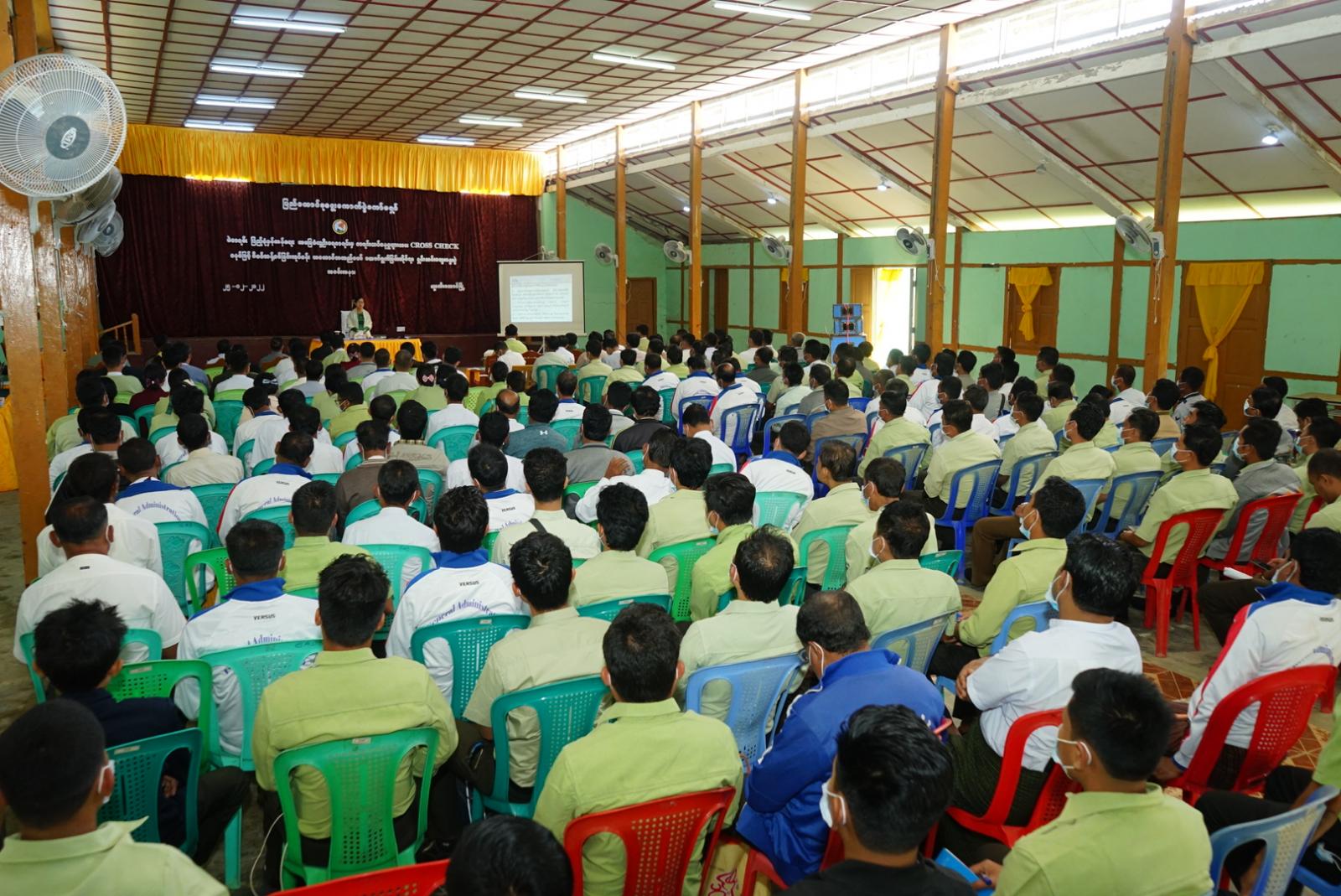 ယင်းနောက် ပြည်ထောင်စုရွေးကောက်ပွဲကော်မရှင်အဖွဲ့ဝင်နှင့် တာ၀န်ရှိသူများသည် ခန်းမ အတွင်း၌ ရွေးကောက်ပွဲကော်မရှင်မှ ဝန်ထမ်းများ၊ အထွေထွေအုပ်ချုပ်ရေးဦးစီးဌာနမှ ဝန်ထမ်းများ လူဝင်မှုကြီးကြပ်ရေးနှင့် ပြည်သူ့အင်အားဝန်ကြီးဌာနမြို့နယ်ရုံးမှ ဝန်ထမ်းများက လူဦးရေစာရင်းများကို ကွန်ပျူတာဆော့ဝဲလ်အသုံးပြု၍ နိုင်ငံသားစိစစ်ရေးကတ်ပြား ထပ်နေသူများ၊ နိုင်ကတ်မရှိသူ/မပြည့်စုံသူများ၊ အသက် ၁၈ နှစ်နှင့်အထက်အောက်ရှိသူများ၊ မွေးသက္ကရာဇ်မပြည့်စုံ သူများ၊ မွေးရက်၊ မွေးလထပ်နေသူများစသည်တို့ကို CROSS CHECK စစ်ဆေးနေမှုကို ကြည့်ရှုအားပေးခဲ့ကြကြောင်း သိရသည်။