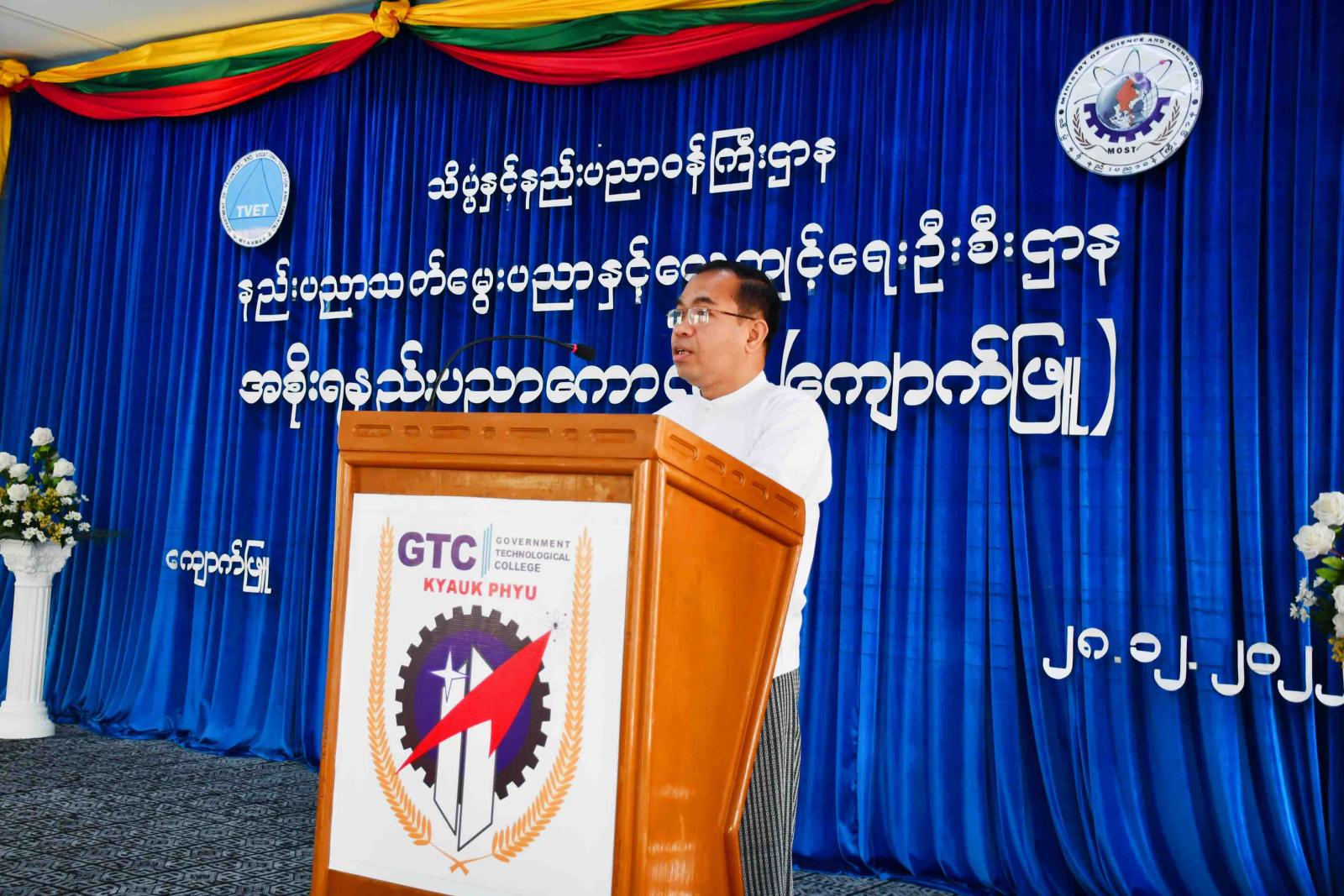 အခမ်းအနားတွင် သိပ္ပံနှင့်နည်းပညာဝန်ကြီးဌာန အမြဲတမ်းအတွင်းဝန်က နည်းပညာ၊ သက်မွေးပညာနှင့် လေ့ကျင့်ရေးကဏ္ဍတွင် မရှိမဖြစ်လိုအပ်လျက်ရှိသော နိုင်ငံတကာ အဆင့်မီ အင်ဂျင်နီယာ နည်းပညာရှင်များကို မွေးထုတ်ပေးနိုင်မည့် အစိုးရနည်းပညာ ကောလိပ်တစ်ကျောင်းကို (၇၅)နှစ်မြောက် စိန်ရတုလွတ်လပ်ရေးနေ့ကို ဂုဏ်ပြုကြိုဆိုသော အားဖြင့် ရခိုင်ပြည်နယ်တွင် စတင်ဖွင့်လှစ်နိုင်ခဲ့ပြီဖြစ်သည့်အတွက် အနာဂတ်အခွင့်အလမ်း ပေါ်ထွန်းလာမှုနှင့်အတူ ကျက်သရေမင်္ဂလာရှိသည့် နေ့တစ်နေ့ဖြစ်ကြောင်း၊ တိုင်းဒေသကြီးနှင့်ပြည်နယ်အသီးသီးရှိ လူငယ်၊လူရွယ်များအနေဖြင့် အင်ဂျင်နီယာ နည်းပညာဘာသာရပ်များကို လေ့လာသင်ယူခွင့် ရရှိစေရန်၊ ဒေသဖွံ့ဖြိုးတိုးတက်ရေးနှင့် လူမှုစီးပွားဘဝဖွံ့ဖြိုးတိုးတက်လာစေရန်ရည်ရွယ်ပြီး အစိုးရနည်းပညာကောလိပ် (ကျောက်ဖြူ)တွင် မြို့ပြအင်ဂျင်နီယာဘာသာရပ်၊ လျှပ်စစ်စွမ်းအား အင်ဂျင်နီယာ ဘာသာရပ်နှင့် စက်မှုအင်ဂျင်နီယာဘာသာရပ် စသည့် အင်ဂျင်နီယာဘာသာရပ် (၃)ခုဖြင့် အင်ဂျင်နီယာနည်းပညာသင်တန်းများဖြစ်တဲ့ (B.Tech) ပထမနှစ်သင်တန်းများကို စတင်ဖွင့်လှစ်သင်ကြားပေးနေပြီဖြစ်ကြောင်း (B.Tech) သင်တန်းအား(၄)နှစ် တက်ရောက်သင်ယူပြီးမြောက်ပါက အင်ဂျင်နီယာနည်းပညာဘွဲ့ Bachelor of Technology-B.Tech ဘွဲ့ကိုပေး အပ်ချီးမြှင့်ပေးသွားမှာဖြစ်ကြောင်း၊ အစိုးရနည်းပညာကောလိပ် (ကျောက်ဖြူ) ဖွံ့ဖြိုးတိုးတက်ရေးအတွက် တာဝန်ရှိသူများနှင့် ဆရာ၊ဆရာမများက စေတနာ၊ ဝါသနာ၊ အနစ်နာ စသည့် ကောင်းမွန်မြင့်မြတ်သော အရင်းခံစိတ်ဓာတ်များဖြင့် ကြိုးပမ်းဆောင်ရွက်ကြစေလိုကြောင်း၊ ကျောင်းသား၊ ကျောင်းသူများအနေဖြင့်လည်း နိုင်ငံတော်ကဖွင့်လှစ်ပေးသည့် အင်ဂျင်နီယာဘာသာရပ်များကို သင်ယူပြီး မိမိအကျိုး၊ မိမိပတ်ဝန်းကျင်အကျိုး၊ မိမိဒေသ၊ မိမိနိုင်ငံတော်အကျိုးတို့ကို သယ်ပိုးထမ်းဆောင်သွားကြမည့် နှလုံးလှသည့် အတတ်ပညာရှင် နိုင်ငံ့သားကောင်းရတနာများဖြစ်အောင် ကြိုးစား လေ့လာသင်ယူသွားကြရန် လိုအပ်ပါကြောင်း တိုက်တွန်းပြောကြားသည်။