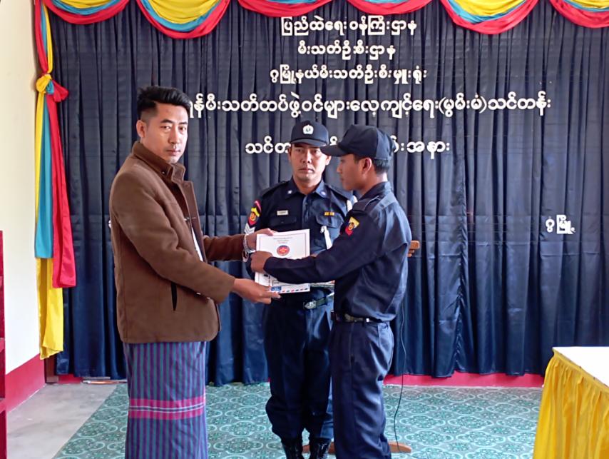 ဆက်လက်၍ သင်တန်းတွင် ဆုရရှိသည့် သင်တန်းသားများကို မြို့နယ်စီမံ အုပ်ချုပ်ရေးအဖွဲ့ဥက္ကဋ္ဌ၊ မြို့နယ်အုပ်ချုပ်ရေးမှူး ဦးဇာနည်ကျော်၊ မြို့နယ်ရဲတပ်ဖွဲ့မှ ရဲမှူးခင်မောင်ထွန်း၊ ဒုတိယမြို့နယ်အုပ်ချုပ်ရေးမှူး ဦးကျော်လင်း၊ မြို့နယ်မီးသတ်ဦးစီးမှူး ဦးမျိုးမင်းထွန်းတို့က ဆုများနှင့် သင်တန်းဆင်းလက်မှတ်များကို ပေးအပ်ချီးမြှင့်ခဲ့ရာ သင်တန်းသားများက လက်ခံရယူခဲ့ကြကြောင်း သိရသည်။