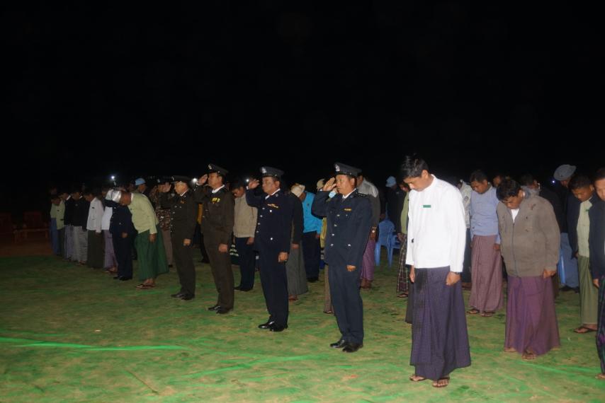 အခမ်းအနားကို နံနက် (၄)နာရီ မိနစ်(၂၀)အချိန်တွင် မြန်မာနိုင်ငံရဲတပ်ဖွဲ့ ဂုဏ်ပြုတပ်ဖွဲ့ဝင်များမှ နိုင်ငံတော်အလံအား တိုင်ထိပ်သို့လွှင့်တင်ပြီး ဂုဏ်ပြုတပ်ဖွဲ့နှင့် အခမ်းအနားသို့ တက်ရောက်လာကြသည့် ခရိုင်စီမံအုပ်ချုပ်ရေးအဖွဲ့ဥက္ကဋ္ဌ ဦးအောင်ဇော်ထက်နှင့် အဖွဲ့ဝင်များ၊ မြို့နယ်စီမံအုပ်ချုပ်ရေးအဖွဲ့ဥက္ကဋ္ဌ ဦးစိုးမင်းထက်နှင့် အဖွဲ့ဝင်များ၊ခရိုင်/မြို့နယ်အဆင့် ဌာနဆိုင်ရာအကြီးအကဲများက နိုင်ငံတော်အလံအား အလေးပြုကြသည်။
