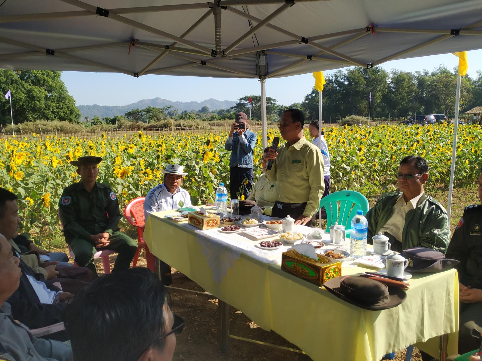 အခမ်းအနားတွင် ခရိုင်စီမံအုပ်ချုပ်ရေးအဖွဲ့ ဥက္ကဋ္ဌ ဦးကျော်မြင့်လှိုင် ကအမှာစကားပြောကြားပြီးနောက် မြို့နယ်စိုက်ပျိုးရေးဦးစီးဌာန၊ မြို့နယ်ဦးစီးမှူး ဦးထွန်းသိန်းက နေကြာမျိုးစေ့ထုတ်စိုက်ခင်း ကွင်းသရုပ်ပြပွဲပြုလုပ်ရသည့်ရည်ရွယ်ချက်များကို ရှင်းလင်းပြောကြားပြီးနောက် တောင်သူများ၏ မေးမြန်းချက်များကို ပြန်လည်ဆွေးနွေးသည်။