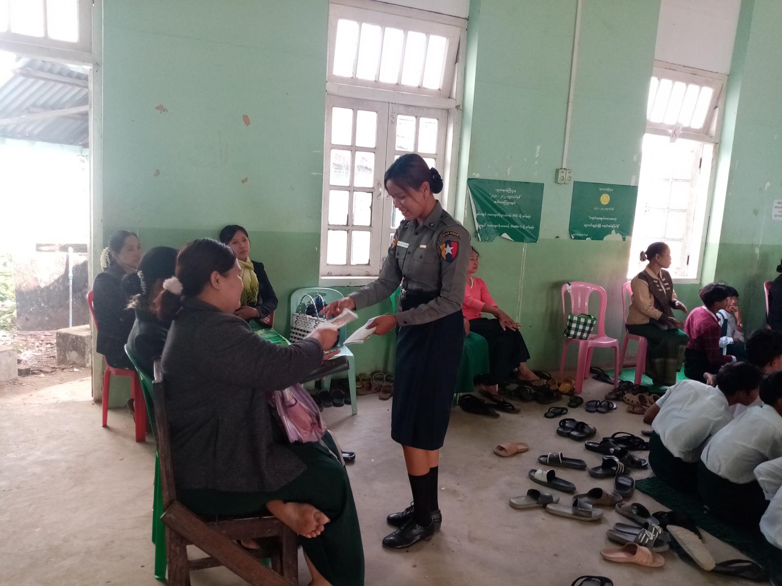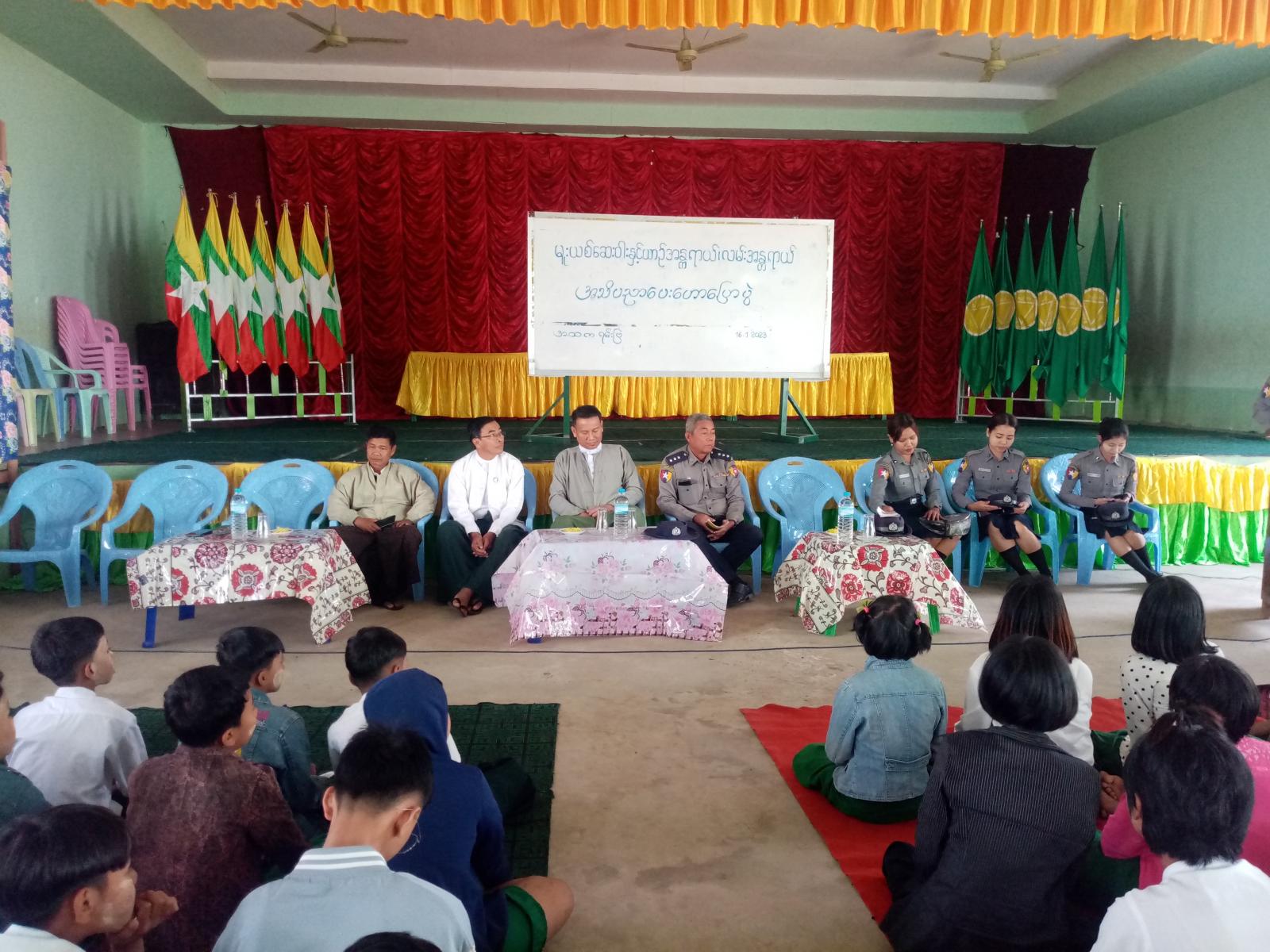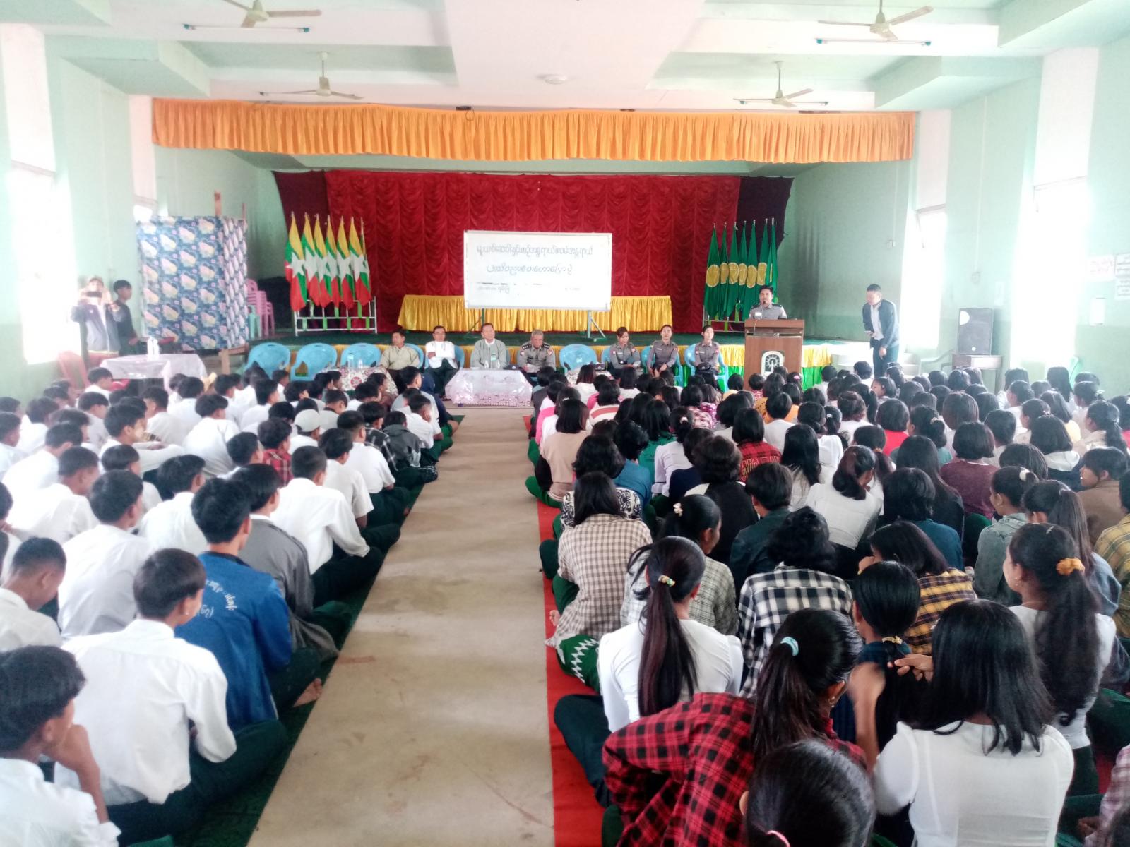 ၎င်းနောက် အသိပညာပေးဟောပြောပွဲအခမ်းအနားသို့ တက်ရောက်ကြသည့် ဆရာ/ဆရာမများနှင့် ကျောင်းသား/ကျောင်းသူများအား မူးယစ်ဆေးဝါးအန္တရာယ် အသိပညာပေးလက်ကမ်းစာစောင်နှင့် ယာဉ်စည်းကမ်းလမ်းစည်းကမ်း အသိပညာပေးလက်ကမ်းစာစောင်များကို အခမဲ့ဖြန့်ဝေပေးခဲ့ကြောင်း သိရသည်။