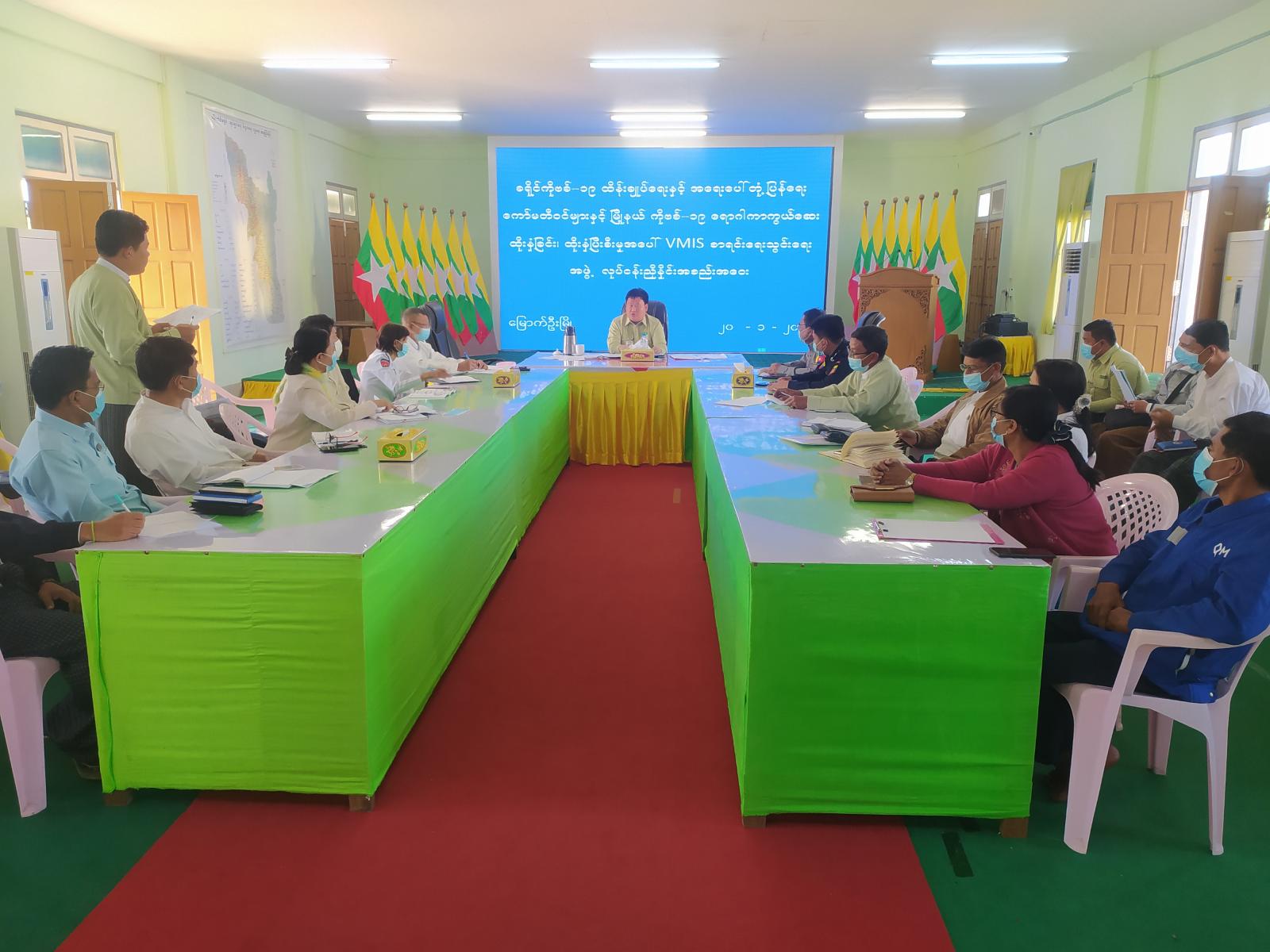 ဆက်လက်၍ ခရိုင် ကိုဗစ်-၁၉ ထိန်းချုပ်ရေးနှင့် အရေးပေါ်တုံ့ပြန်ရေးကော်မတီဝင်များက ကိုဗစ်-၁၉ရောဂါ ကွယ်ထိန်းချုပ်ရေးကိစ္စရပ်များ ကာကွယ်ဆေးထိုးနှံပြီးစီးမှုအပေါ် VMIS စနစ်ဖြင့် ရာနှုန်းပြည့်စာရင်းရေးသွင်းနိုင်ရေး ကိစ္စရပ်များကို ဝိုင်းဝန်းဆွေးနွေးကြရာ လိုအပ်သည် များကို ခရိုင်စီမံအုပ်ချုပ်ရေးအဖွဲ့ဥက္ကဋ္ဌမှ ပေါင်းစပ်ညှိနှိုင်းပေးခဲ့ကြောင်း သိရသည်။