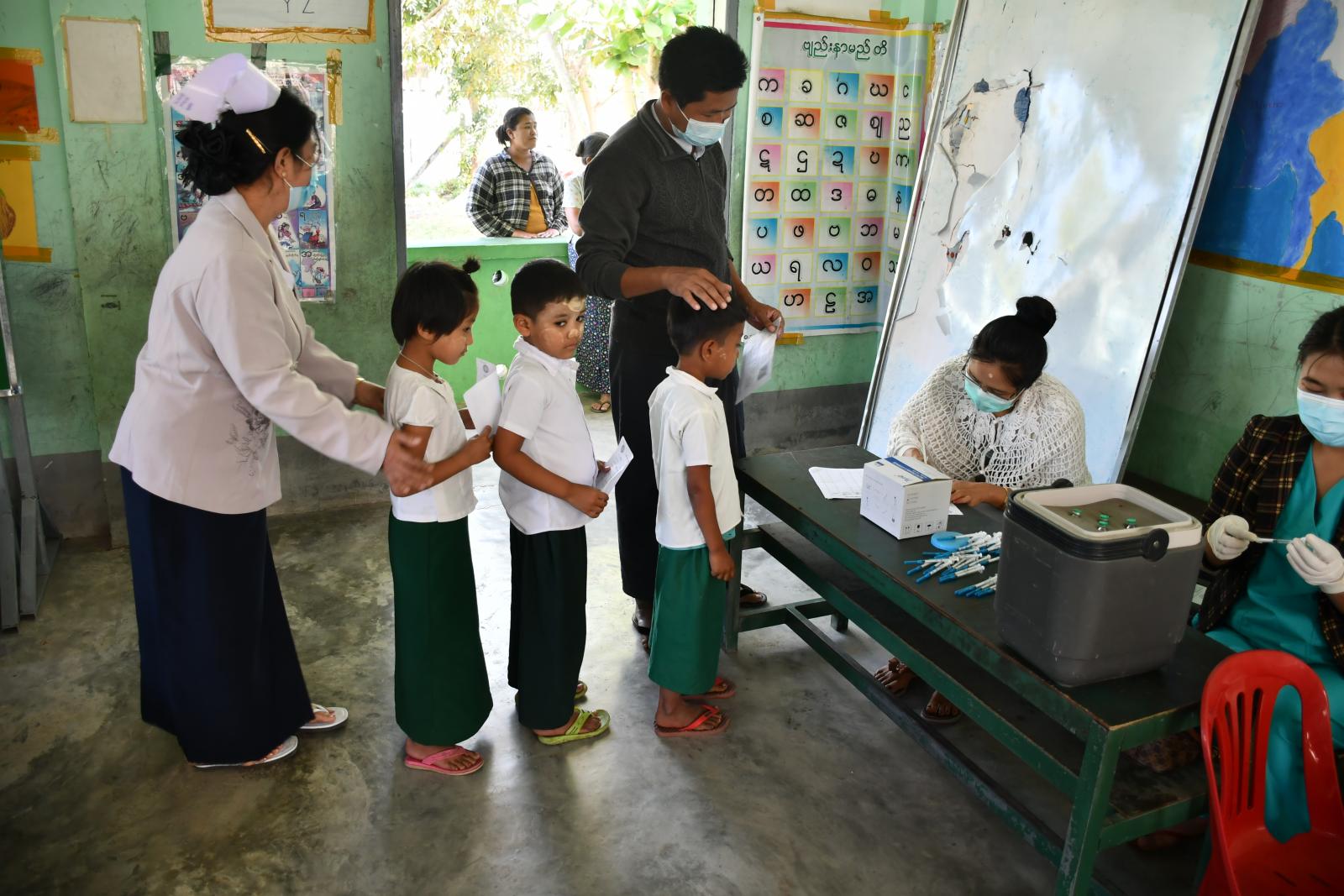 ရခိုင်ပြည်နယ်၊ ကျောက်ဖြူမြို့နယ်အတွင်းရှိ အခြေခံပညာကျောင်းများဖြစ်သည့် အမက(အောက်ရွာ)ကျောင်း၊ အလက(ငလပွေ့)ကျောင်းနှင့် အလက(ကုလားဘာတောင်) (မြို့)ကျောင်းများမှ အသက်(၅)နှစ်မှ (၁၂) နှစ်အတွင်းရှိ ကျောင်းသား၊ကျောင်းသူများကို ယနေ့နံနက်ပိုင်းက ကျန်းမာရေးဌာနမှဝန်ထမ်းများက အဆိုပါကျောင်းများသို့သွားရောက်၍ ကိုဗစ်-၁၉ ရောဂါ ကာကွယ်ဆေးအား ထိုးနှံပေးလျက်ရှိသည်။