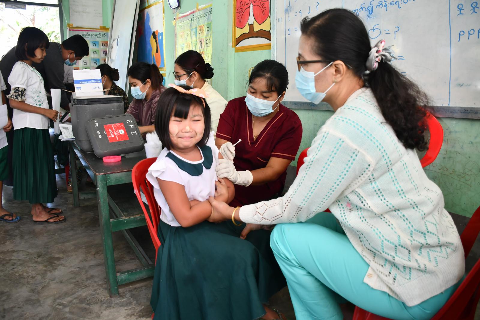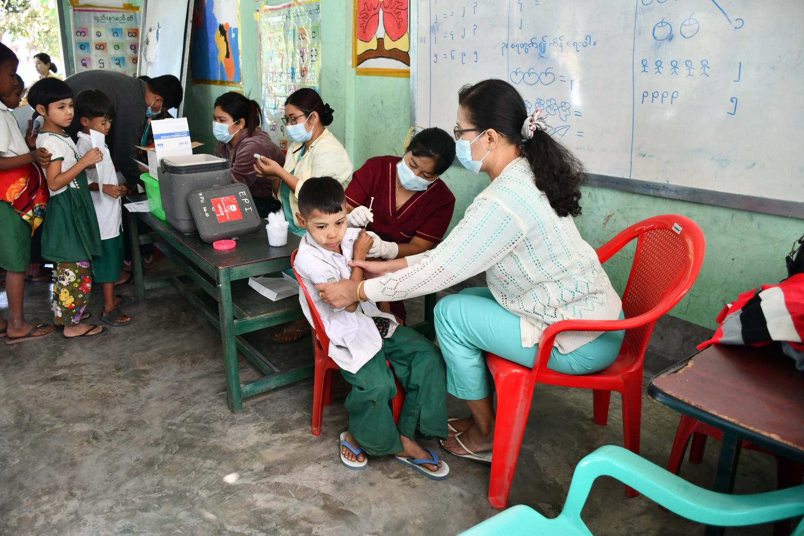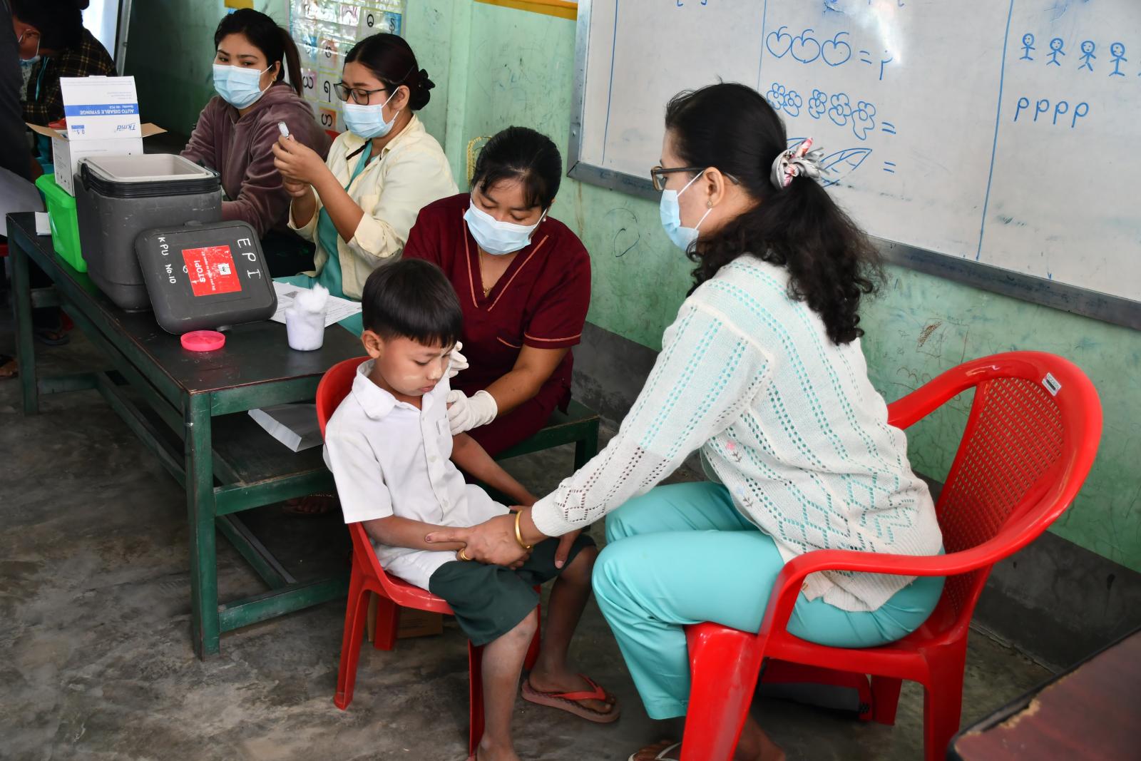 ထိုသို့ အသက်(၅)နှစ်မှ (၁၂)နှစ်အတွင်းရှိသည့် ကျောင်းသား၊ကျောင်းသူများအား ကိုဗစ်-၁၉ရောဂါ ကာကွယ်ဆေးထိုးနှံပေးလျက်ရှိရာတွင် ဆေးထိုးနှံခြင်းမပြုမီ စာရင်းမှတ်တမ်းရေးသွင်းကောက်ယူခြင်း၊ ကိုယ်အပူချိန်တိုင်းပေးခြင်း၊ ကျန်းမာရေးစစ်ဆေးခြင်းများကို တာဝန်ကျဆရာ၊ဆရာမများနှင့် ကျန်းမာရေးဌာနမှဝန်ထမ်းများက ကူညီဆောင်ရွက်ပေးပြီး ကျန်းမာရေးဌာနမှဝန်ထမ်းများက ကိုဗစ်-၁၉ရောဂါကာကွယ် ဆေးအားထိုးနှံပေးခြင်းဖြစ်ကာ ဆေးထိုးနှံမှုပြီးပါက သတ်မှတ်နေရာများတွင် မိနစ် (၃၀) ခန့်စောင့်ကြည့်ခြင်းကို ကြက်ခြေနီတပ်ဖွဲ့ဝင်များက အနီးကပ်စောင့်ကြပ်ကာ လိုအပ်သည်များကို ကူညီဆောင်ရွက်လျက်ရှိသည်။