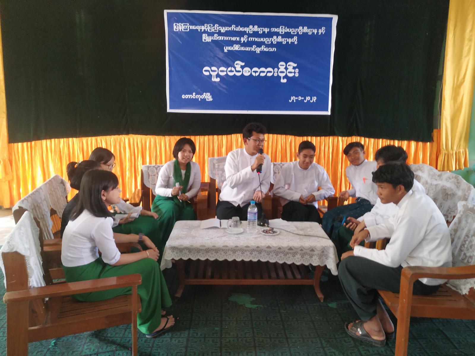 ထို့နောက် လူငယ်စကားဝိုင်း ကိုကျင်းပရာ အမှတ်(၁)၊အခြေခံပညာအထက်တန်းကျောင်းမှ တာဝန်ခံ ကျောင်းအုပ် ဦးဇော်မျိုးနိုင် က ဦးဆောင်ဆွေးနွေးသူအဖြစ် ပါဝင်ဆောင်ရွက်ပြီး အထက(၁)၊ Grade-10(A)မှ မောင်စိုးမြတ်လင်း ၊ မဖူးပွင့်ခိုင်(Grade-10(A)၊ အထက(၂) Grade-10 မှ မောင်ဇွဲထက်ကျော် ၊ မမေသင်းခိုင် (Grade-10)၊ အထက(၃) Grade-10 မှ မောင်အောင်ပိုင်ပိုင်ဖြိုး ၊ Grade-11 မှ မညိုညိုစံ ၊ အထက(၄) Grade-10(A) မှ မယုပပအောင် နှင့် Grade-9(B) မှ မောင်သက်ဘုန်းအောင် တို့က လူ့အဖွဲ့အစည်းနှင့် ပူးပေါင်း ဆောင်ရွက်မှု ခေါင်းစဉ်ဖြင့်ဆွေးနွေးပြီး ကျောင်းသား၊ ကျောင်းသူများ၏ ပြန်လည်မေးမြန်းမှုများကို ဦးဆောင်ဆွေးနွေးသူ ဦးဇော်မျိုးနိုင်နှင့်စကားဝိုင်းတွင်ပါဝင်ဆွေးနွေးသူ ကျောင်းသား၊ကျောင်းသူများက ပြန်လည်ဖြေကြားဆွေးနွေး သည်။
