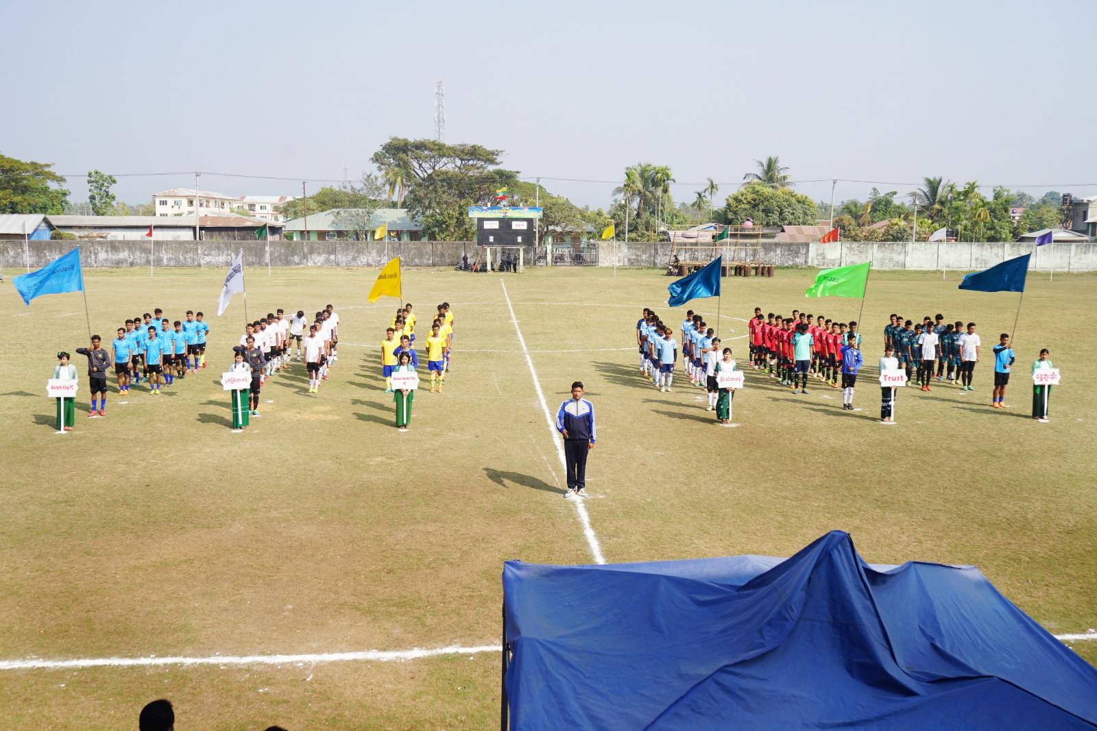 ရှေးဦးစွာ ပြိုင်ပွဲများအသင်းများက အားကစားကွင်းအတွင်း နေရာယူပြီး ခရိုင်စီမံအုပ်ချုပ်ရေးအဖွဲ့ ဥက္ကဋ္ဌအားအလေးပြုကာအသင်းများအားအပ်နှံခဲ့ သည်။ထို့နောက် ခရိုင်စီမံအုပ်ချုပ်ရေးအဖွဲ့ဥက္ကဋ္ဌ ဦးနေဦးက အဖွင့်အမှာစကားပြောကြားရာတွင် ပြိုင်ပွဲကျင်းပရခြင်း၏ ရည်ရွယ်ချက်ဖြစ်သော စုပေါင်းပါဝင်ဆောင်ရွက်တတ်စေရန်နှင့် မိမိ၏တာဝန်ဝတ္တရားများကိုကျေပွန်စွာ ထမ်းဆောင်နိုင်ပြီး၊ အားကစား၏ အနှစ်သာရကို ပေါ်လွင်လာစေရန်၊ မူးယစ်ဆေးဝါးကင်းစင်၍ ကျန်းမာကြံ့ခိုင်သော လူသားအရင်းအမြတ်များ ပေါ်လာစေရန်၊ ထူးခွန်ထက်မြတ်သည့် အလားအလာရှိသော မျိုးဆက်သစ် အားသစားသမားများ ပေါ်ထွန်းလာစေရန် ဆိုတဲ့မြင့်မားသော စသည့် ရည်ရွယ်ချက်များနှင့်ကျင်းပရ ခြင်းဖြစ်ကြောင်း ပြောကြားခဲ့သည်။ ဆက်လက်၍ နယ်မြေခံစစ်ဆင်ရေးကွပ်ကဲရေးမှူး၊ ခရိုင်စီမံ အုပ်ချုပ်ရေးအဖွဲ့ဥက္ကဋ္ဌနှင့် အဖွဲ့ဝင်များ၊ မြို့နယ်စီမံအုပ်ချုပ်ရေးအဖွဲ့ဥက္ကဋ္ဌနှင့်အဖွဲ့ဝင်များနှင့် ဌာနဆိုင်ရာအကြီးအကဲများက ပြိုင်ပွဲဝင်အသင်းများအား လိုက်လံနှုတ်ဆက်ခဲ့ကြပြီး ပြိုင်ပွဲဝင်အသင်းများက အားကစားသစ္စာအဓိဌာန်ရွက်ဆိုခဲ့သည်။ ယင်းနောက် (၇၆) နှစ်မြောက်ပြည်ထောင်စုနေ့ အထိမ်း အမှတ် ခရိုင်စီမံအုပ်ချုပ်ရေးအဖွဲ့ဥက္ကဋ္ဌဖလား အမျိုးသား အလွတ်တန်း ဘောလုံးပြိုင်ပွဲအား နယ်မြေခံစစ်ဆင်ရေး ကွပ်ကဲရေးမှူး ဗိုလ်မှူးချုပ်သူရိန်ထွန်းက ဘောလုံးကန်၍ ဖွင့်လှစ်ခဲ့ပြီး အမျိုးသား အလွတ်တန်းဘောလုံးပြိုင်ပွဲအားကျင်းပရာ “ရွှေဘူးသီး”နှင့် “Western Border City F.C” အသင်းတို့ယှဉ်ပြိုင်ကစားခဲ့ကြသည်။ ပြိုင်ပွဲတွင်အသင်း(၆)သင်း ပါဝင်ယှဉ်ပြိုင်ကစားမည်ဖြစ်ရာ ပြိုင်ပွဲကို (၃၀-၁-၂၀၂၃)နေ့မှ(၁၀-၂-၂၀၂၃)နေ့အထိ ကျင်းပပြုလုပ်မည်ဖြစ်ကြောင်း သိရသည်။