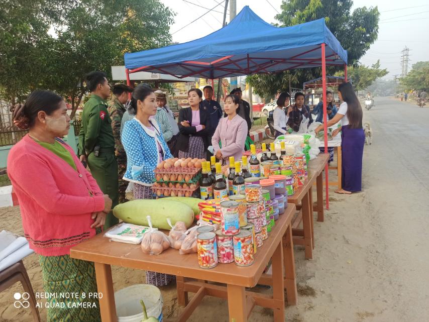 အဆိုပါ အခြေခံစားကုန်နှင့် ဟင်းသီးဟင်းရွက်များအား သက်သာသောစျေးနှုန်းဖြင့် ရောင်းချပေးခြင်းကို မြို့နယ်စီမံအုပ်ချုပ်ရေးအဖွဲ့ဥက္ကဋ္ဌ ဦးဇာနည်ကျော်နှင့် အဖွဲ့ဝင်များက ကြည့်ရှုအားပေးခဲ့ကြသည်။ အဆိုပါ စားသောက်ကုန်နှင့် ဟင်းသီးဟင်းရွက်များအား နယ်မြေခံတပ်ရင်းနှင့် မြို့နယ်စိုက်ပျိုးရေးဦးစီးဌာနမှ တာဝန်ရှိသူများက ဆန်၊ အသား၊ ငါး၊ ကြက်ဥ၊ ပဲ၊ စည်သွတ်ဘူး၊ ငံပြာရည်၊ ခေါက်ဆွဲခြောက်၊ ကြာဆန်၊ စားတော်ပဲဘူး၊ ပဲထောပတ်ဘူး၊ ပဲခရမ်းချဉ်ဘူး၊ ငါးသလောက်ဘူး၊ သရက်သီးသနပ်ဘူး၊ ငါးပိကြော်၊ ကန်စွန်းရွက်၊ ချဉ်ပေါင် စသည့် အခြေခံစားသောက်ကုန်ပစ္စည်းများနှင့် ဒေသထွက်ဟင်းသီးဟင်းရွက်များကို သက်သာသောစျေးနှုန်းဖြင့်ရောင်းချပေးခဲ့ကြောင်း သိရသည်။