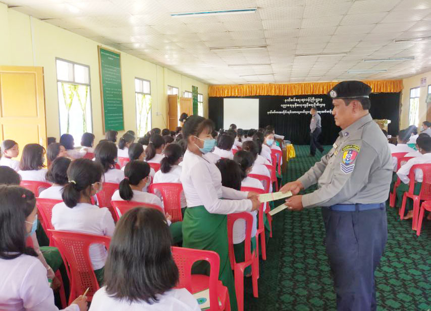 ရခိုင်ပြည်နယ်၊ မောင်တောခရိုင်၊ မောင်တောမြို့၌ နယ်စပ်ရေးရာဝန်ကြီးဌာန၊ နယ်စပ်ဒေသတိုင်းရင်းသားလူငယ်များဖွံ့ဖြိုးရေး သင်တန်းကျောင်းတွင် မူးယစ်ဆေးဝါး၊ လူကုန်ကူးမှုတားဆီးကာကွယ်ရေးနှင့် ယာဉ်/လမ်းစည်းကမ်း အသိပညာပေးဟောပြောခြင်းကို ဇန်နဝါရီလ ၃၁ ရက်နေ့ နံနက်ပိုင်းက အဆိုပါကျောင်းခန်းမတွင် ပြုလုပ်ခဲ့သည်။